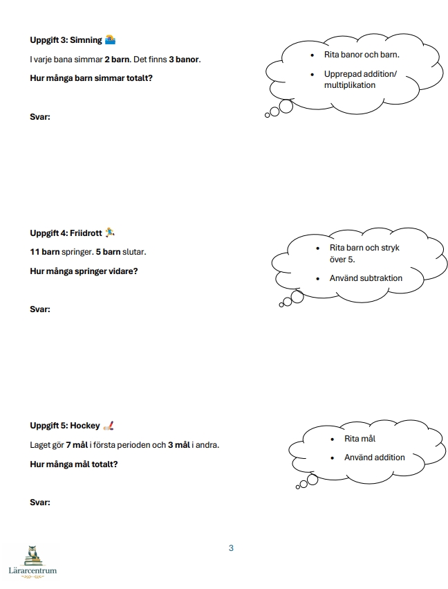 Detta problemlösningshäfte är anpassat för åk 2–3 (fungerar även i åk 1 med stöd och åk 4 för repetition) och innehåller varierade matematikuppgifter med ett motiverande sporttema.