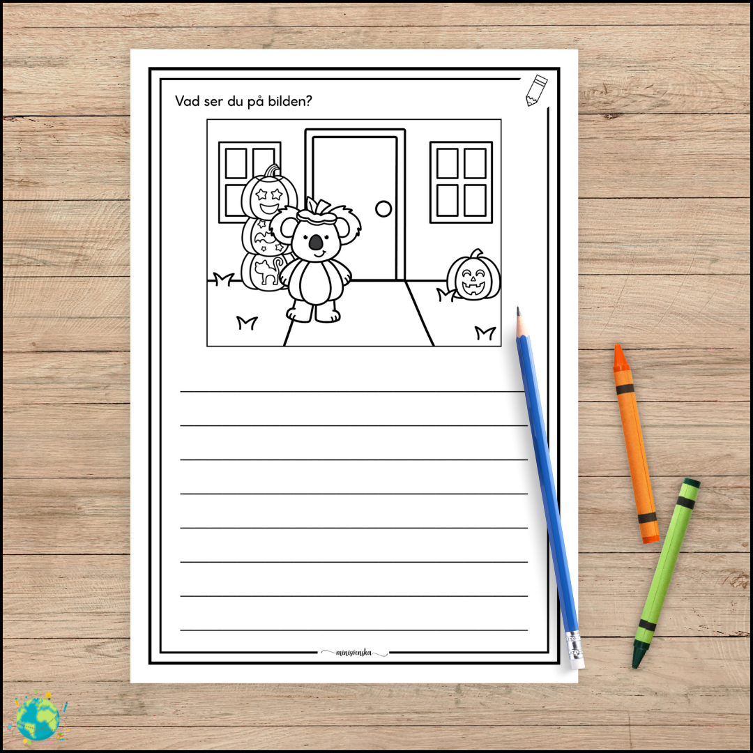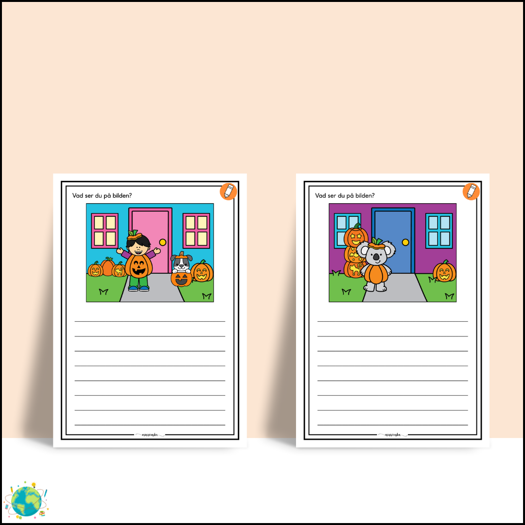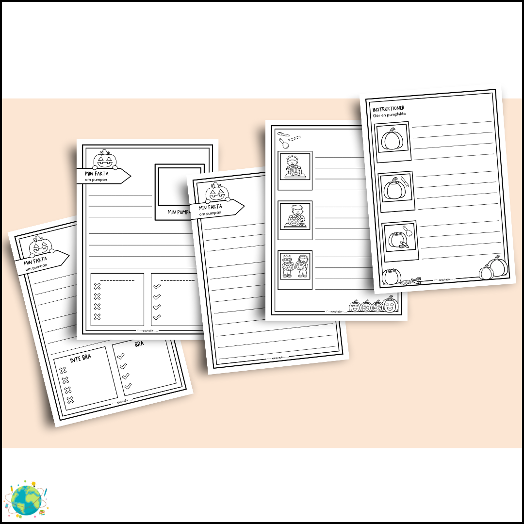 4 olika skrivuppgifter till Halloween! Materialet finns i färg och utan färg. 20 sidor PDF: A4 Innehåll: Skriv en instruerande text om hur man gör en pumplykta Skriv en faktatext om pumpan Rita och skriv fakta om "Min pumpa". Skriv till bilden