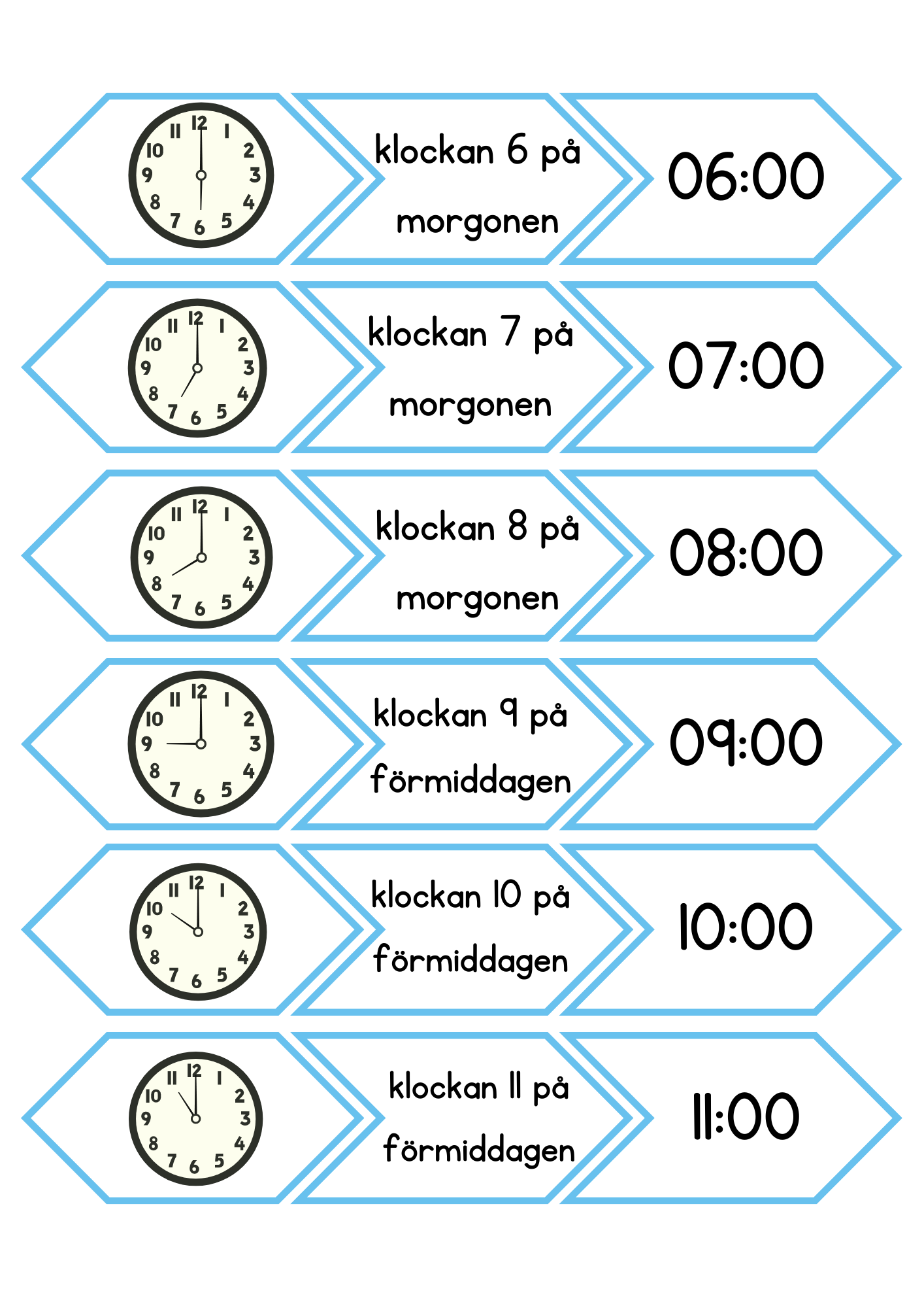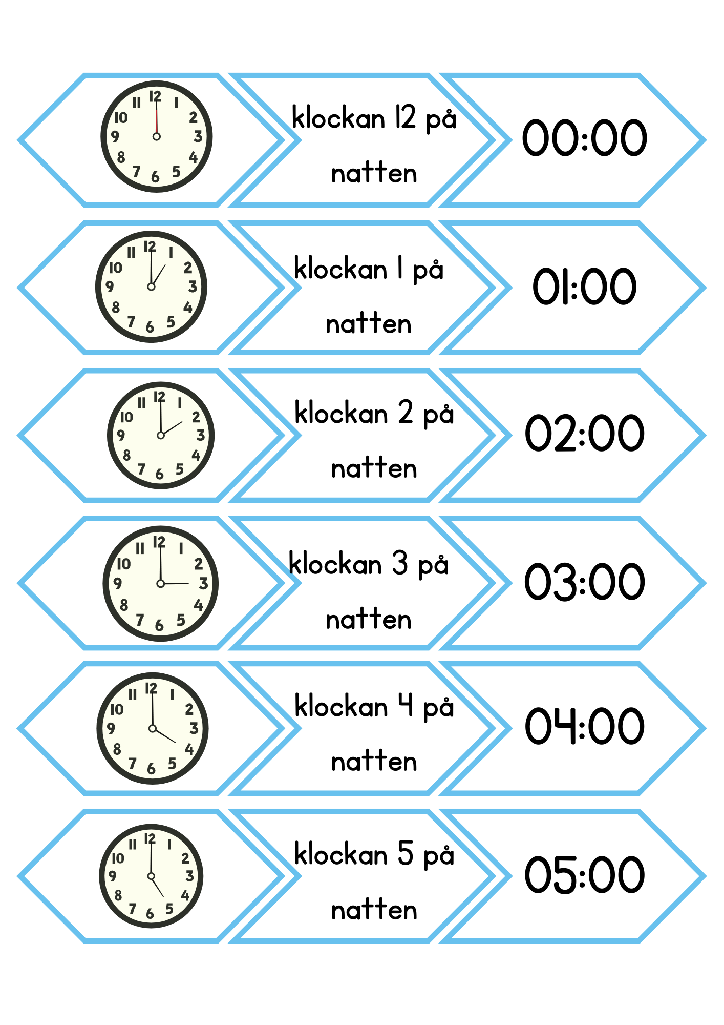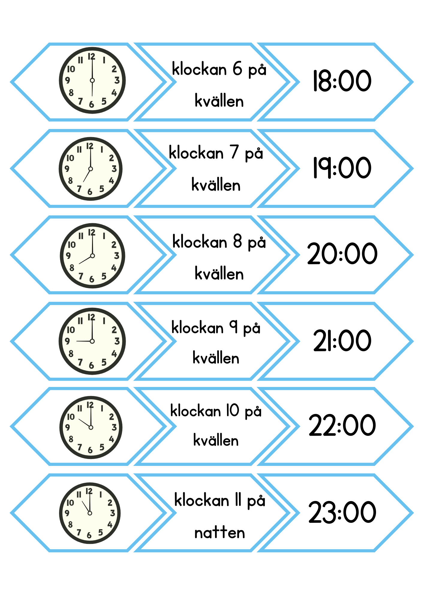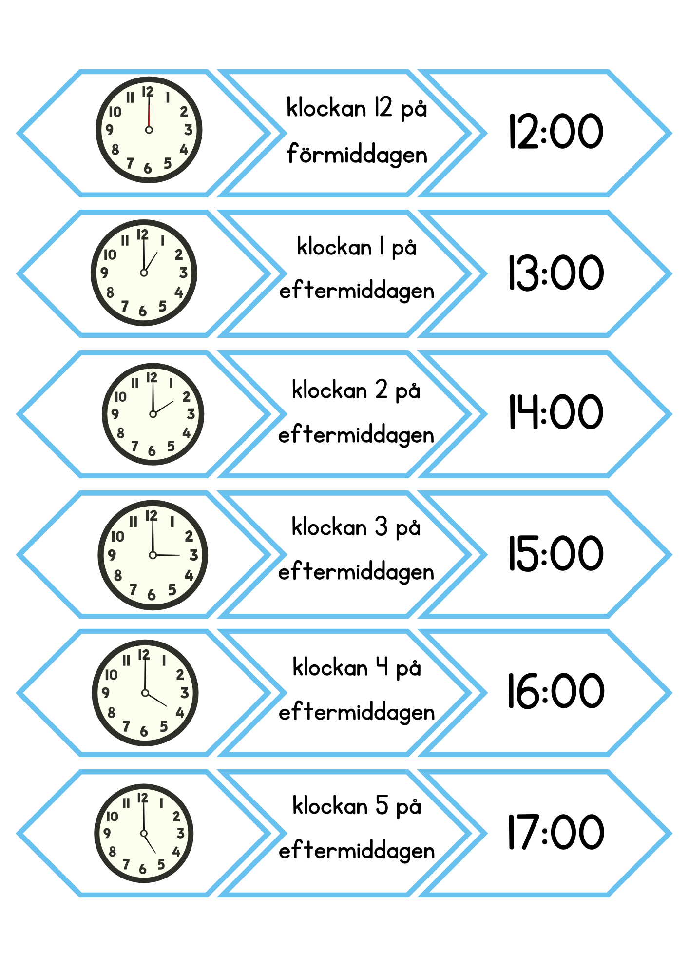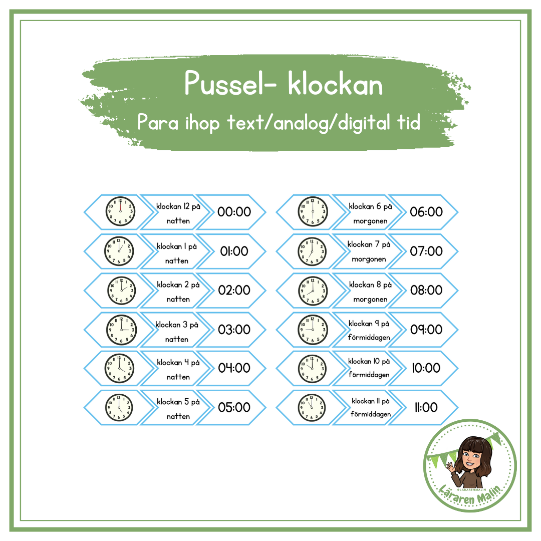 Pussel/hör vi ihop/memory med klockan. Para ihop text, analog samt digital tid. Totalt 24 par.