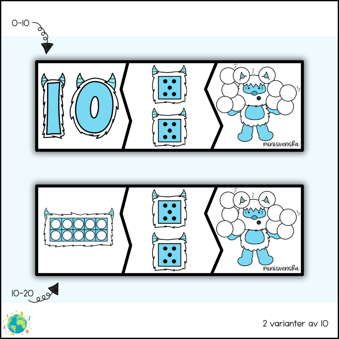 Pussel där eleverna matchar siffra, antal och bild. Ett konkret och lekfullt sätt att arbeta med taluppfattning. Passar bra i stationer eller mindre grupper.