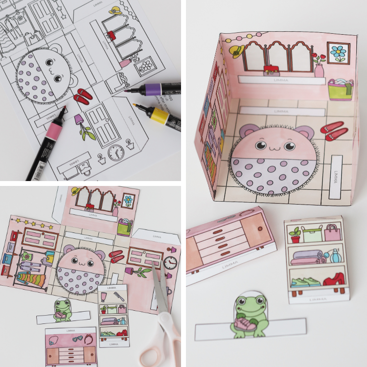 Pyssla ett dockhus i 3D. Färglägg, klipp ut och limma ihop. Alla rum i serien passar med varandra, bygg ut och mixa som du vill i ditt dockhus.