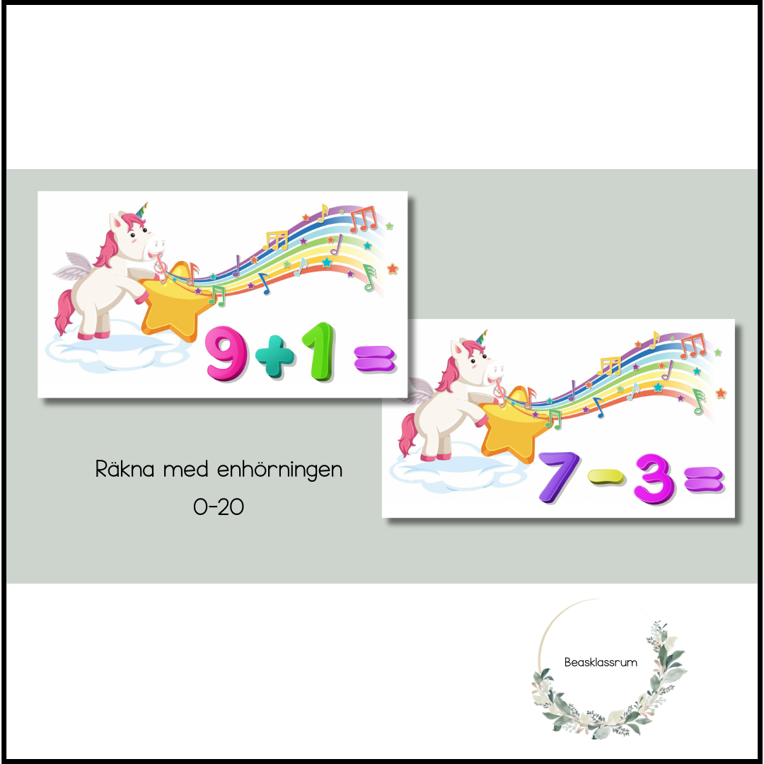Räkna med enhörningen. Perfekt som startuppgift på t.ex. smartboard för att få igång eleverna. Räkna tillsammans eller enskilt. 8 sidor