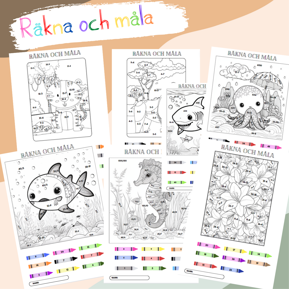 7st räknemålor av blandade svårighetsgrader. Addition, subtraktion, multiplikation och division. Sjöhäst, fisk, tiger, bläckfisk, liljor, gorilla och haj.