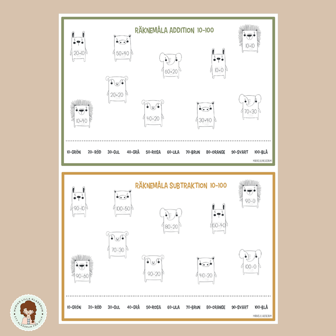2 stenciler -räknemåla addition och subtraktion 10-100 Räkna och färglägg. Träna talområdet 10-100
