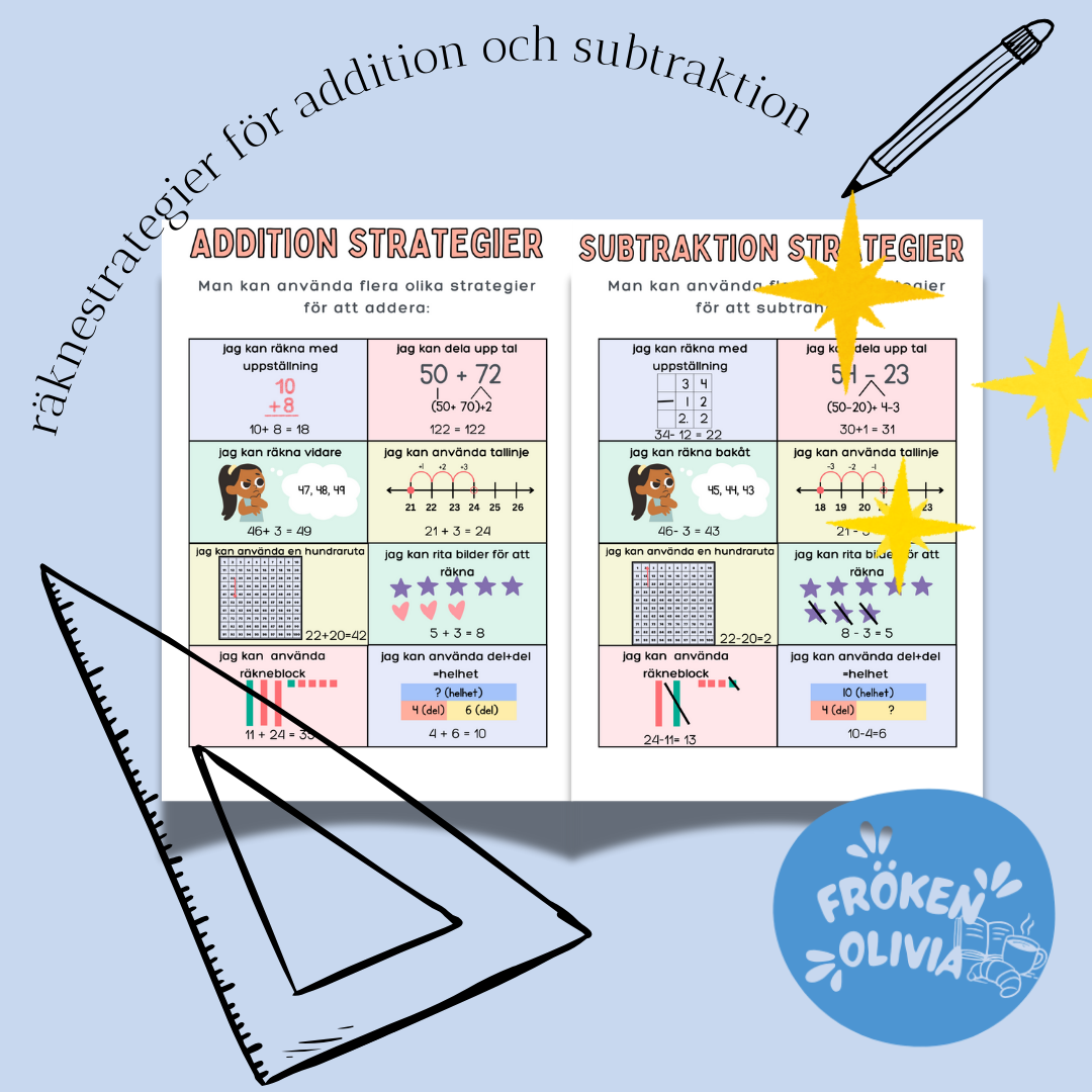 synliggör strategier för addition och subtraktion i matematiken för eleverna med dessa posters.