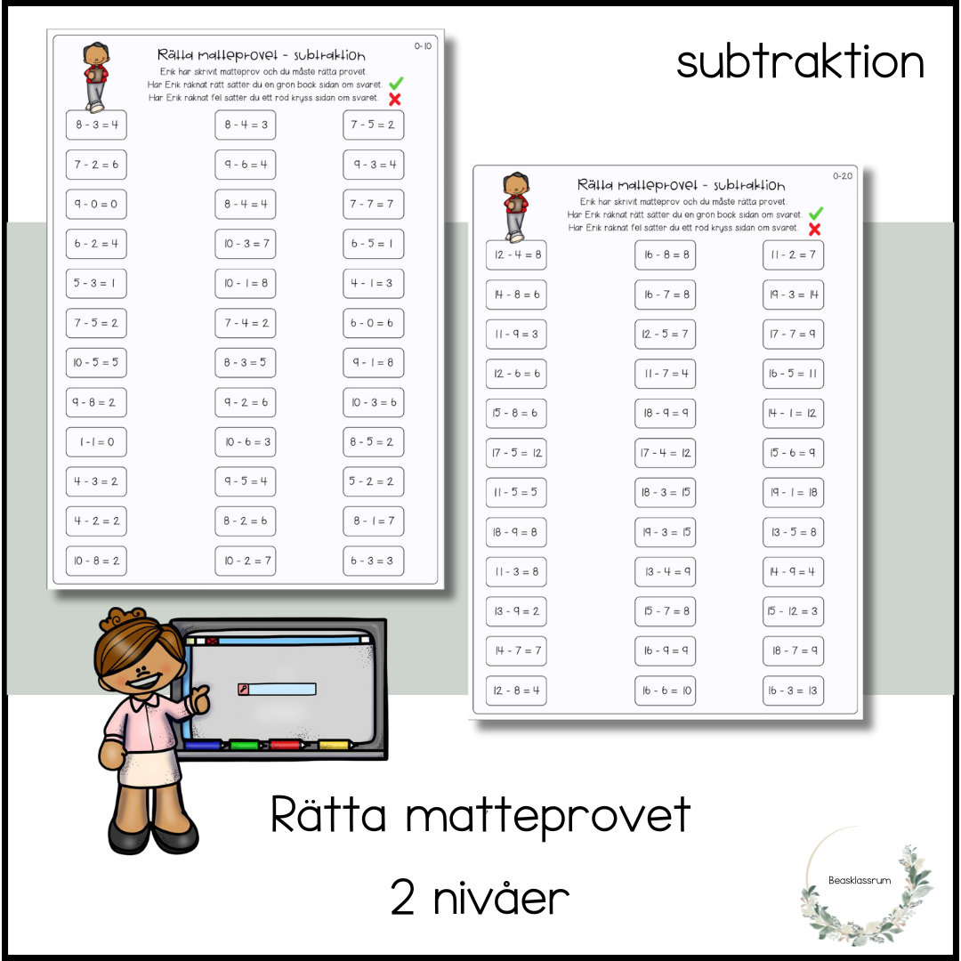 Låt eleverna få vara lärare och rätta matteprovet. Materialet finns i 2 nivåer, 0-10 och 0-20.