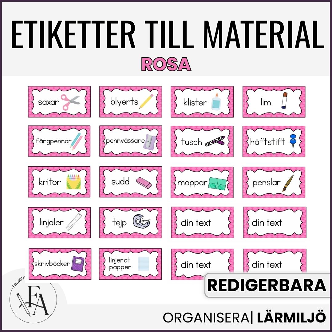Stilrena etiketter att märka upp material med i klassrummet, på förskolan eller fritidshem. Materialet består av 18 färdiga etiketter med text och bild över vanligt förekommande material och en redigerbar version där du själv bestämmer texten och lägger in egna bilder. Filen kan redigeras i Powerpoint eller Keynote.