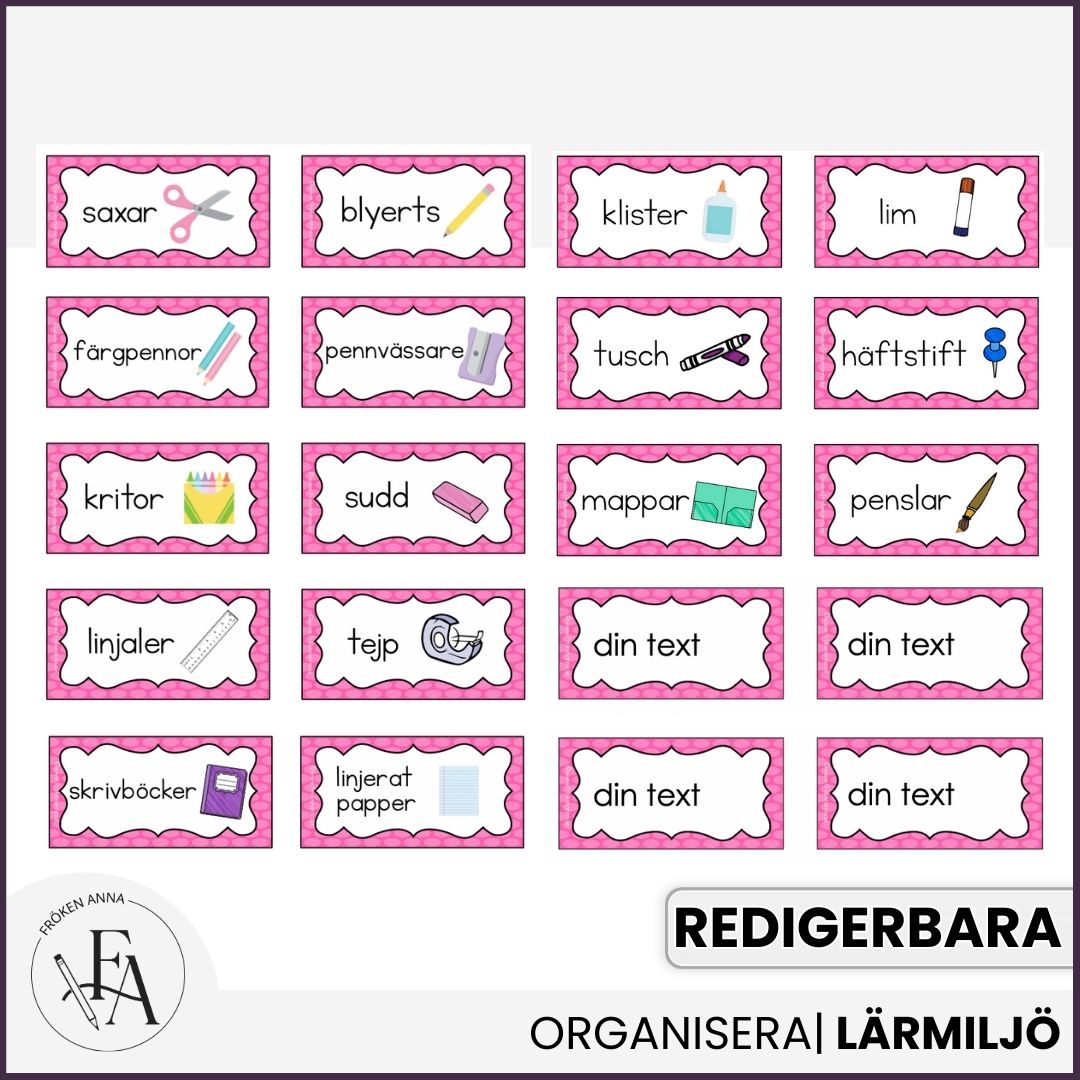 Stilrena etiketter att märka upp material med i klassrummet, på förskolan eller fritidshem.