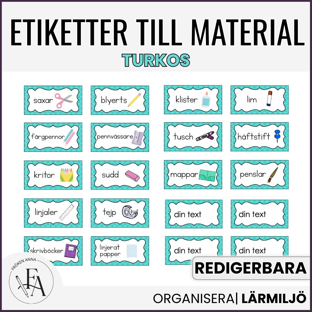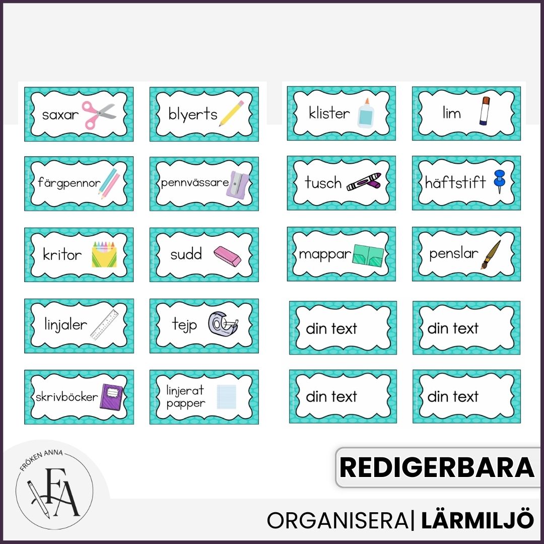 Stilrena etiketter att märka upp material med i klassrummet, på förskolan eller fritidshem. Materialet består av 18 färdiga etiketter med text och bild över vanligt förekommande material och en redigerbar version där du själv bestämmer texten och lägger in egna bilder. Filen kan redigeras i Powerpoint eller Keynote.