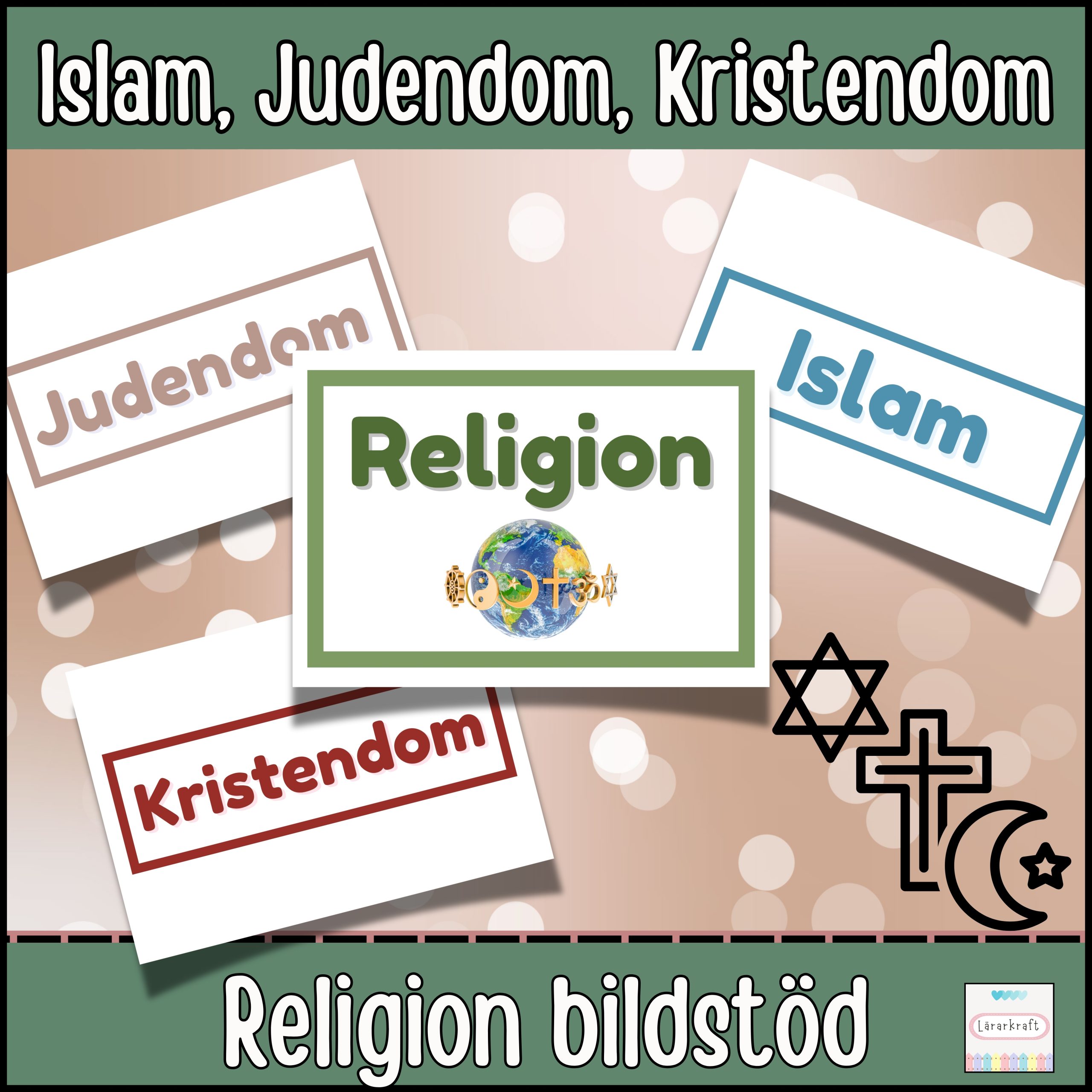 22 Bildstöd innehåller:  Kristendom: Bibel, kors, kyrka, kristna,präst, jul Islam: koran, halvmånen, moske, muslimer,imam, eid al fitr Judendom: Toran, judar, rabbin, sabbaten, synagoga, davidsstjärna