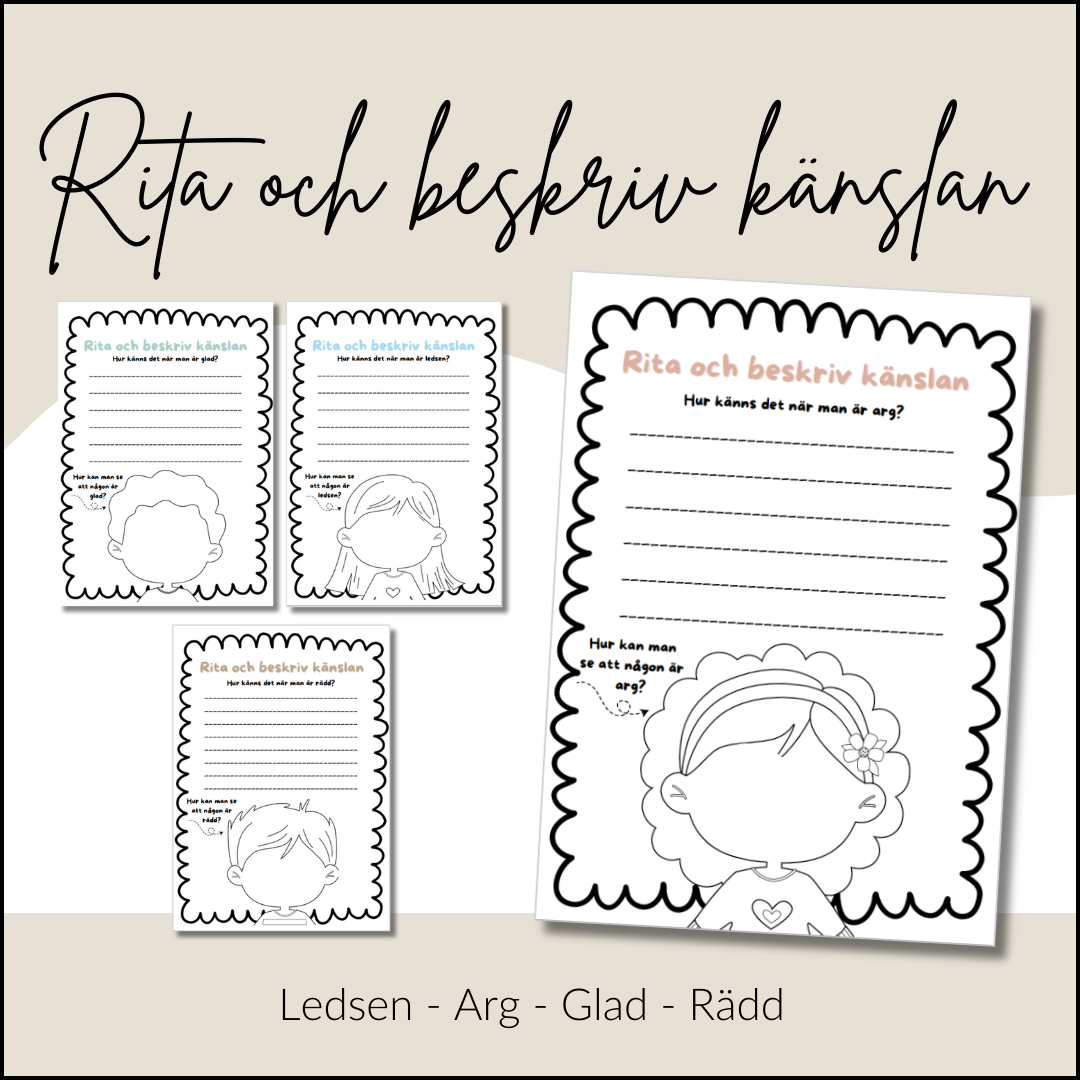 Hej på er 🙂 Här kommer ett material där dina elever får fundera kring hur olika känslor känns och ser ut. Låt de fundera kring hur man ser ut och och känner sig när man är ledsen, arg, glad eller rädd. Perfekt för att få en större förståelse för sig själv och för andra.