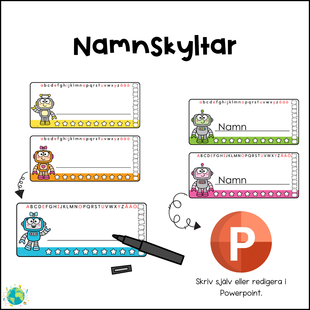 Varje namnskylt har alfabetet som stöd, en skrivyta för namnet och en tydlig design som fungerar lika bra på bänkar, dörrar eller väggar. Materialet kan användas direkt eller enkelt redigeras i PowerPoint.