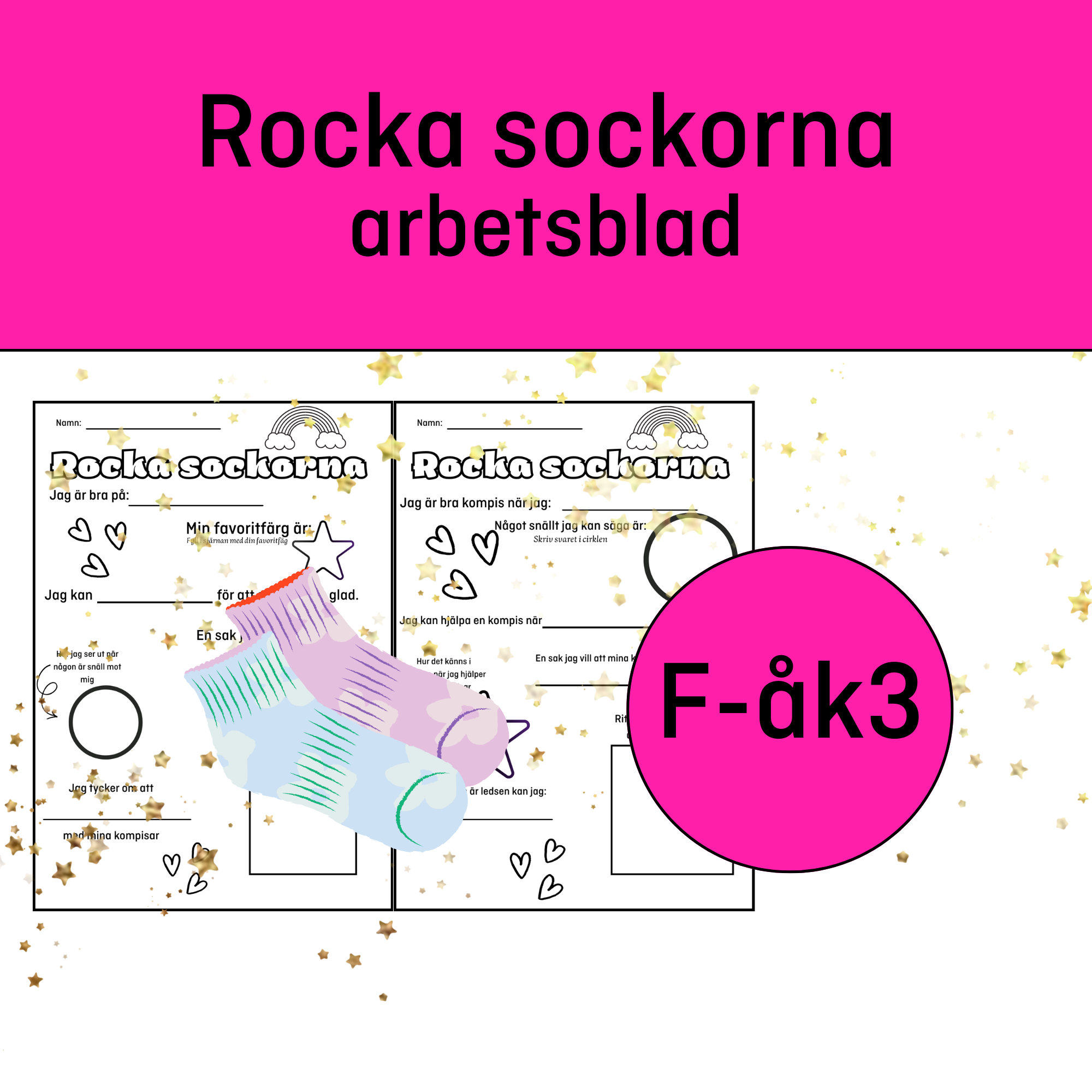Detta arbetsmaterial är ett reflektions- och värdegrundsblad kopplat till Rocka sockorna-dagen, som uppmärksammas den 21 mars varje år. Dagen handlar om att synliggöra och hylla människors olikheter samt att sprida kunskap om att alla människor har lika värde. Genom att bära olika strumpor symboliserar man att det är helt okej att vara olika. Arbetsbladet är riktat till elever i förskoleklass till årskurs 3 (F–3) och syftar till att skapa reflektion kring vänskap, empati, självkänsla och hur vi kan vara bra kompisar mot varandra. Uppgifterna är utformade på ett enkelt och tillgängligt sätt så att eleverna kan arbeta både individuellt och tillsammans med klasskamrater. I arbetsbladet får eleverna reflektera över frågor som exempelvis vad de är bra på, vad som gör dem glada, hur man kan vara en bra kompis och hur man kan hjälpa andra. Eleverna får även fundera över snälla saker man kan säga till någon annan och hur det känns när någon är snäll mot dem. Genom dessa frågor uppmuntras eleverna att tänka kring sina egna styrkor och hur deras handlingar kan påverka andra människor i positiv riktning. Materialet innehåller också rit- och skrivytor där eleverna kan uttrycka sina tankar genom både text och bild. Detta gör arbetsbladet tillgängligt även för yngre elever som ännu inte har utvecklat ett fullt skriftspråk. Den visuella utformningen med symboler, hjärtan och illustrationer bidrar till att skapa ett engagerande och tryggt material som passar elever i de tidiga skolåren. Arbetsbladet kan användas som en del av ett temaarbete kring olikheter, inkludering och skolans värdegrund i samband med Rocka sockorna-dagen. Det kan fungera som en introduktion till klassdiskussioner om hur man skapar ett inkluderande klassrum där alla känner sig välkomna och respekterade. Genom att arbeta med dessa frågor får eleverna möjlighet att utveckla empati, förståelse och respekt för varandra, vilket är centrala delar i skolans värdegrundsarbete. Syftet med materialet är att stärka elevernas självkänsla och samtidigt uppmärksamma betydelsen av att visa omtanke och respekt för andra, oavsett vilka olikheter som finns mellan människor. På så sätt kopplas arbetet till Rocka sockorna-dagens budskap om att olikheter är något positivt som berikar både skolan och samhället.
