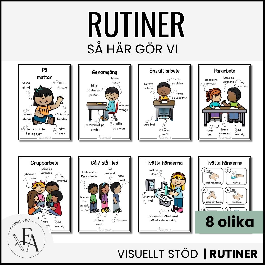 Skapa ordning och struktur i klassrummet, på förskolan eller fritids med färgglada och tydliga posters över dagliga rutiner. Dessa posters hjälper eleverna att förstå och följa viktiga rutiner, från samling på mattan till genomgångar, enskilt arbete och grupparbete. De innehåller enkla och visuella instruktioner som påminner eleverna om att lyssna aktivt, hålla fokus, och arbeta tillsammans i lugn och ro.
