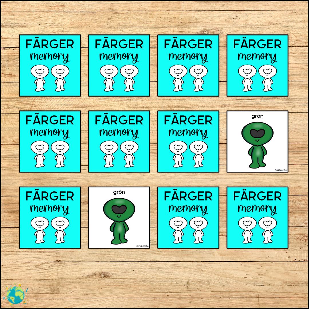 Ett klassiskt memoryspel med fokus pÄ fÀrger, dÀr eleverna trÀnar minne, koncentration och fÀrgbegrepp tillsammans med charmiga alienfigurer.