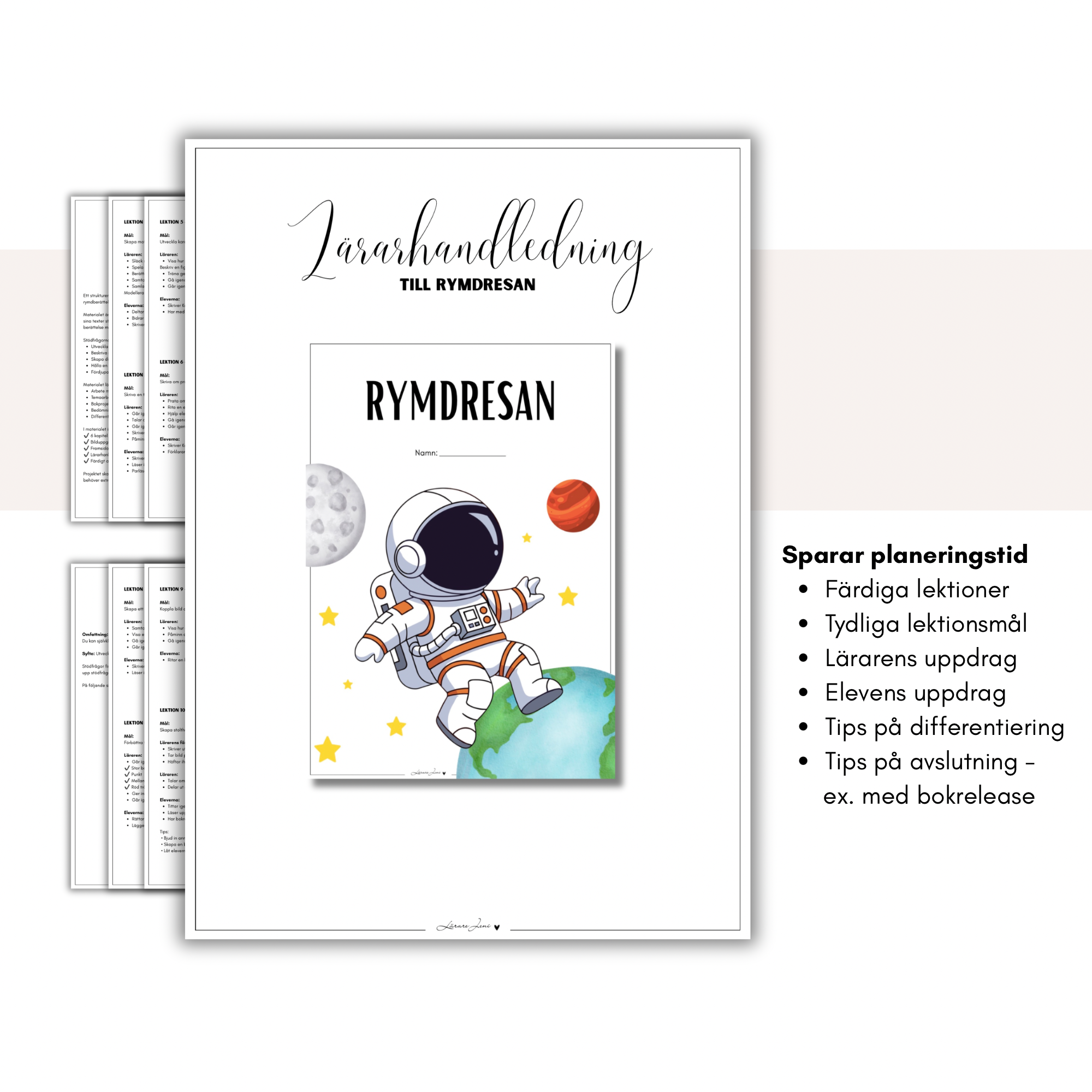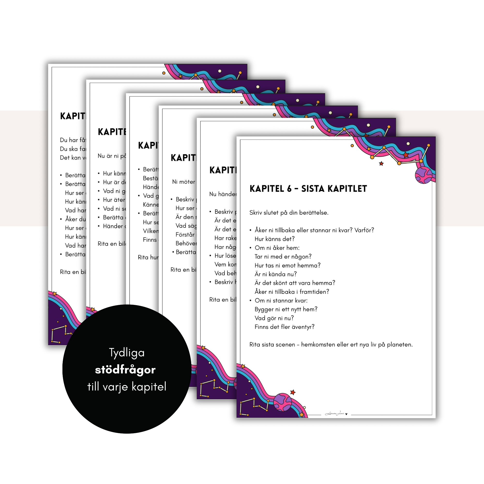 Ett komplett skrivprojekt i svenska där eleverna skriver en egen kapitelbok med tema rymden. Materialet innehåller: tydlig lärarhandledning med 10 färdiga lektioner tydliga stödfrågor till varje kapitel färdig framsida och kapitelframsidor för elevernas egna illustrationer linjerade skrivpapper Ett strukturerat och tidsbesparande paket för arbete med berättande text i åk 2–3 och ger samtidigt eleverna en tydlig struktur för att lyckas med sitt skrivande.