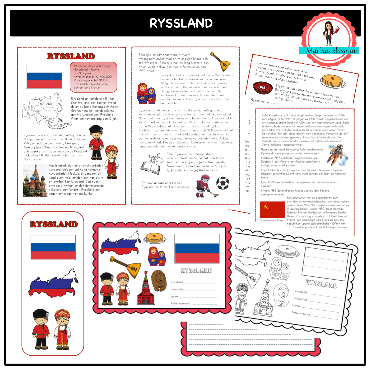I detta material ingår 5 fakta-blad om Ryssland där eleverna får lära sig om landet och sedan skapa en reklam-folder om landet eller skicka en hälsning med ett vykort.