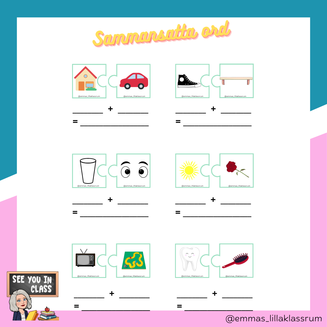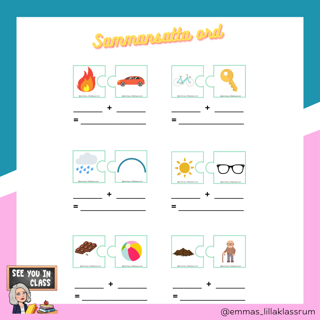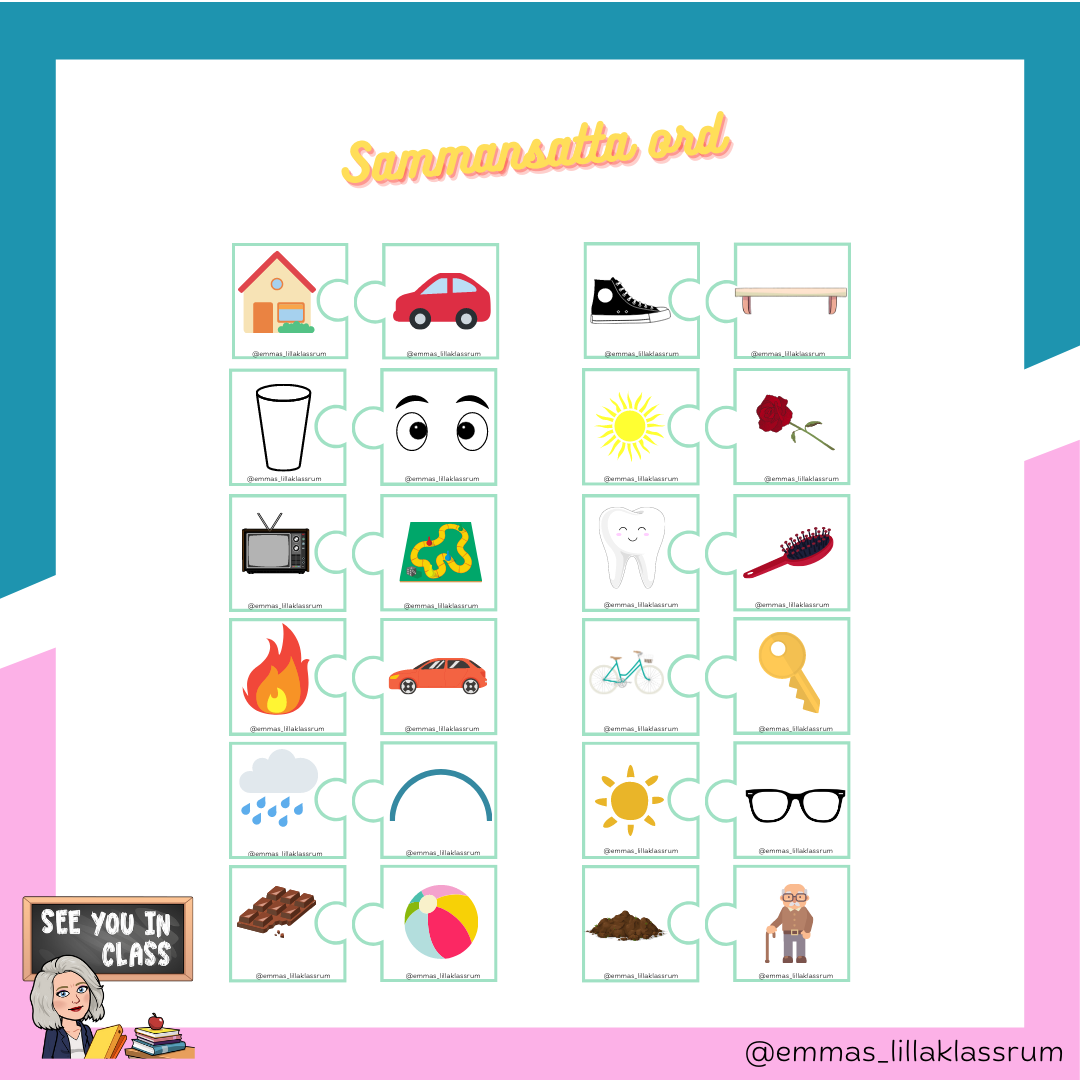 Ett material som tränar sammansatta ord. Totalt finns det 36 sammansatta ord. Materialet består av två delar. En där eleverna ska skriva de två orden separat och sedan vad det sammansatta ordet blir. Den andra delen består av två pusselbitar med bilder, eleverna ska då para ihop bilderna så de bildar ett sammansatt ord. En rolig övning att göra tillsammans.