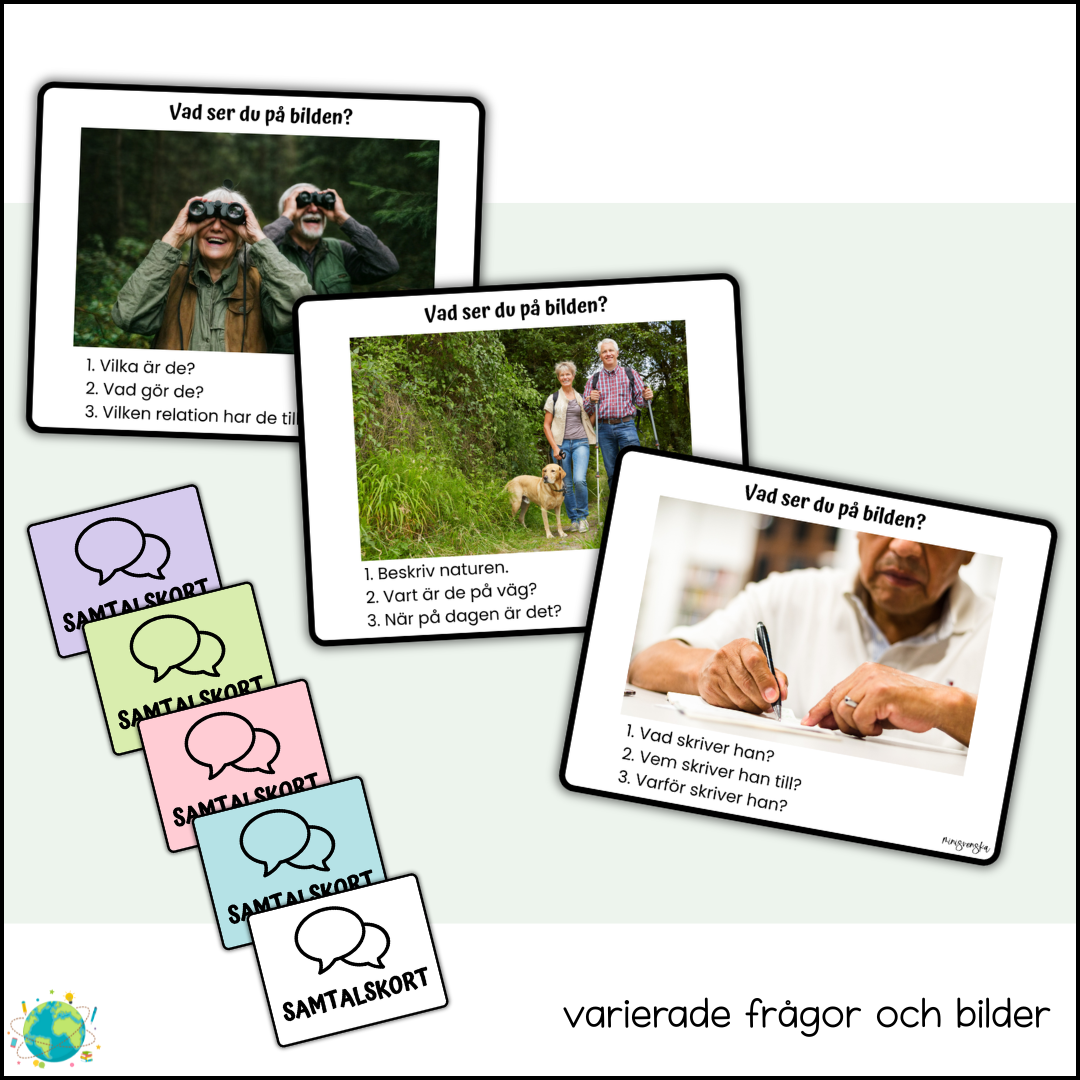 Varje samtalskort utgår från en bild och innehåller öppna frågor som hjälper eleverna att: