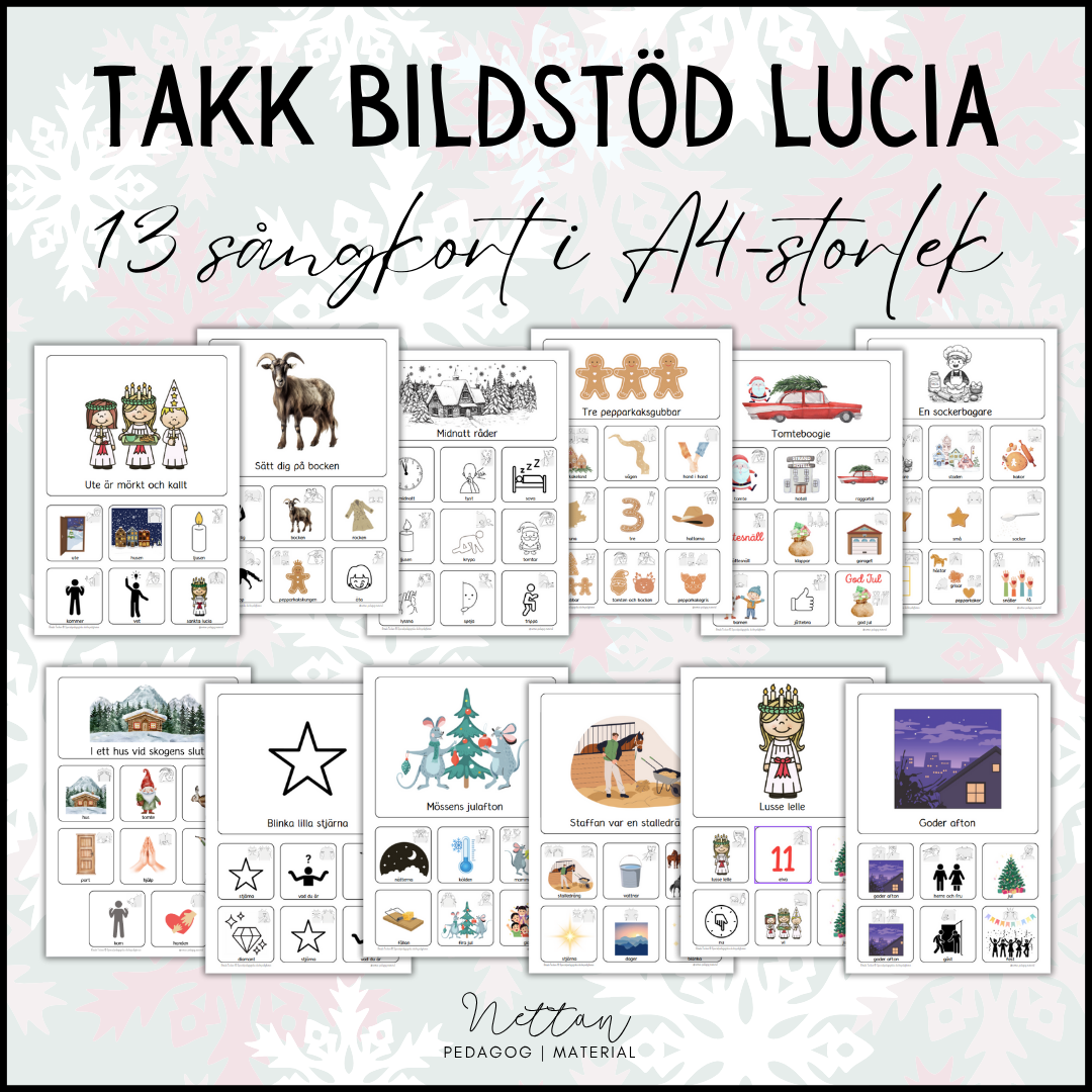 13 kort (A4-storlek) med bildstöd och TAKK till sånger vi ofta sjunger vid lucia. Varje sång har sex till nio utvalda ord med bilder samt tecken som stöd. Sångtexter medföljer