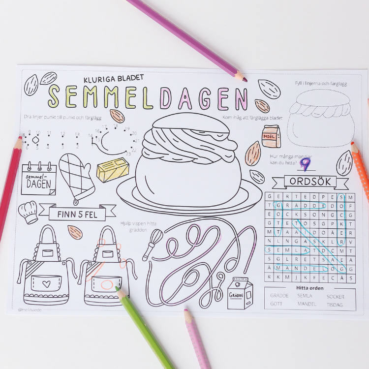 Klurigt pysselblad med tema semmeldagen. Här får eleverna rita, räkna, finn fem fel, färglägg, punkt till punkt, ordsök, med mera.