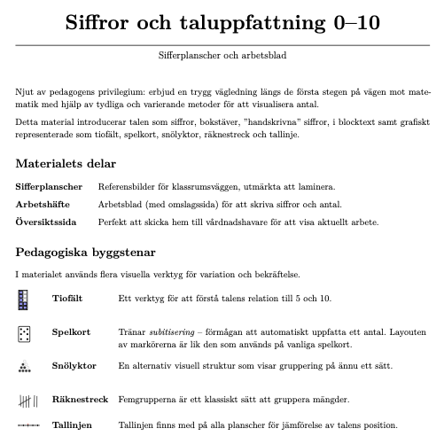 Erbjud en trygg vägledning längs de första stegen på vägen mot matematiken. Detta material är ett omfattande paket (24 sidor) designat för att utveckla elevens relationella förståelse för tal. Materialet hjälper eleven att gå från konkret räknande till att se matematiska strukturer.