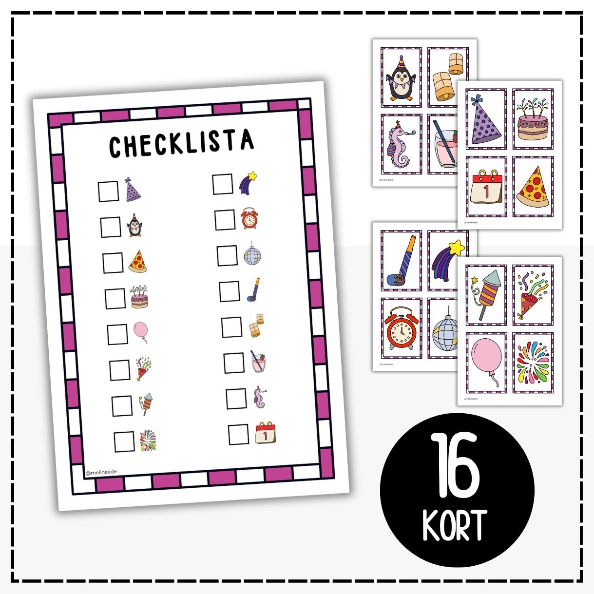Ordna en skattjakt på nyår. Placera ut de 16 korten och skattjakten kan börja. Låt barnen leta efter motiven som prickas av på checklistan.