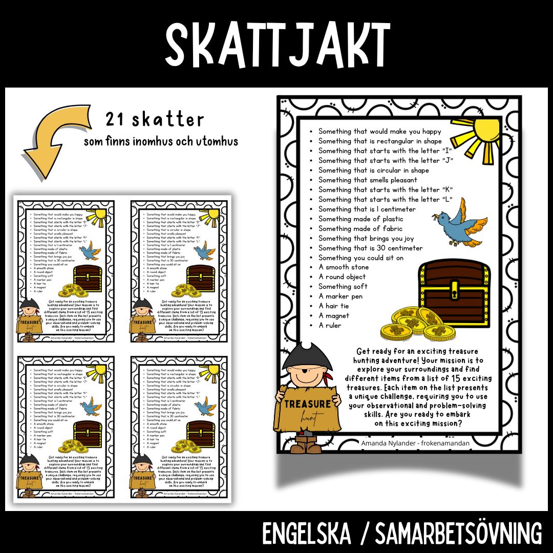 Låt eleverna gå på skattjakt, inomhus eller utomhus, och samla in skatter. Låt eleverna sedan muntligt presentera var och en av sina skatter för sina klasskompisar. Avsluta momentet med att eleverna själva får göra sina egna skattjaktsmallar. Materialet låter eleverna bekanta sig med det engelska språket på ett roligt och lekfullt sätt.