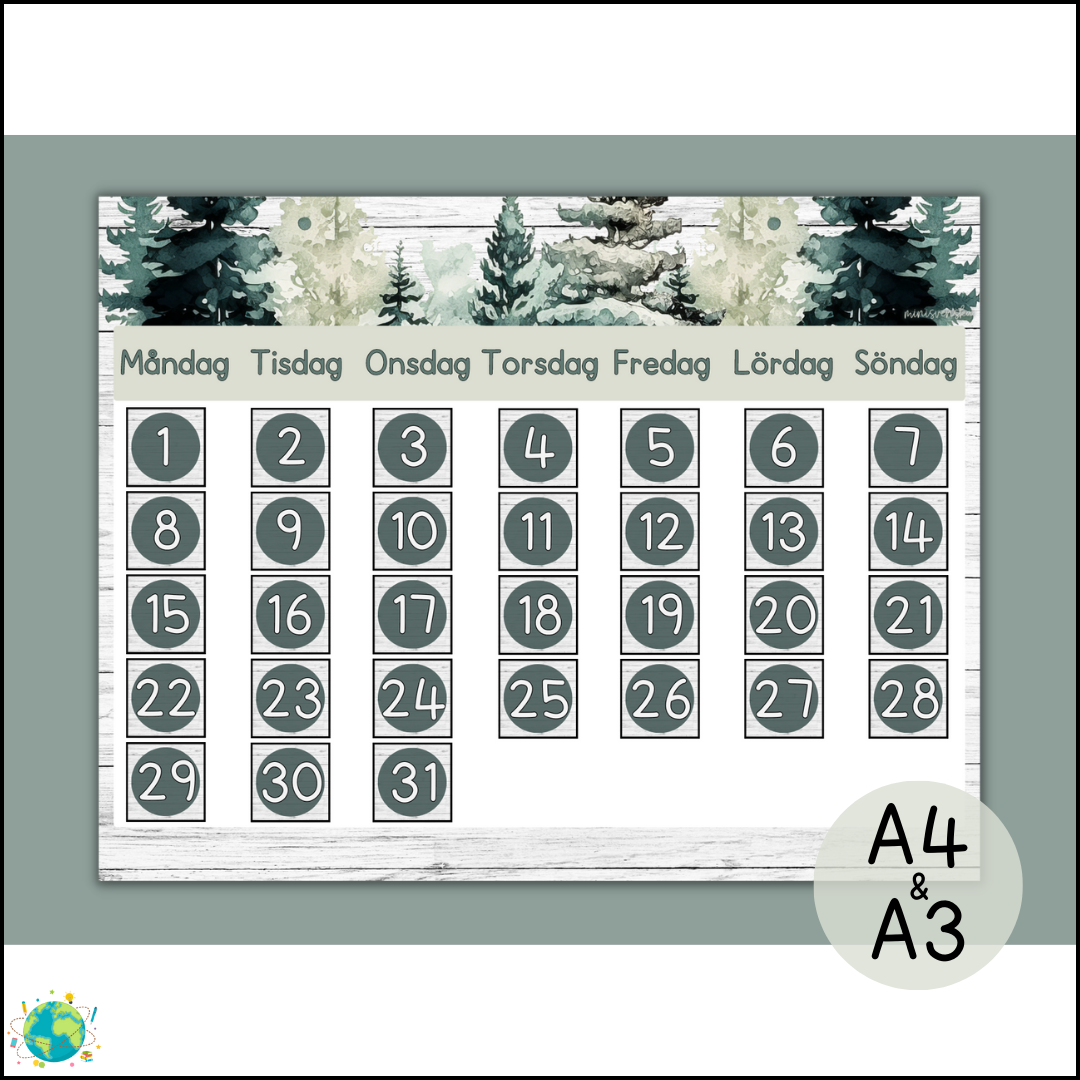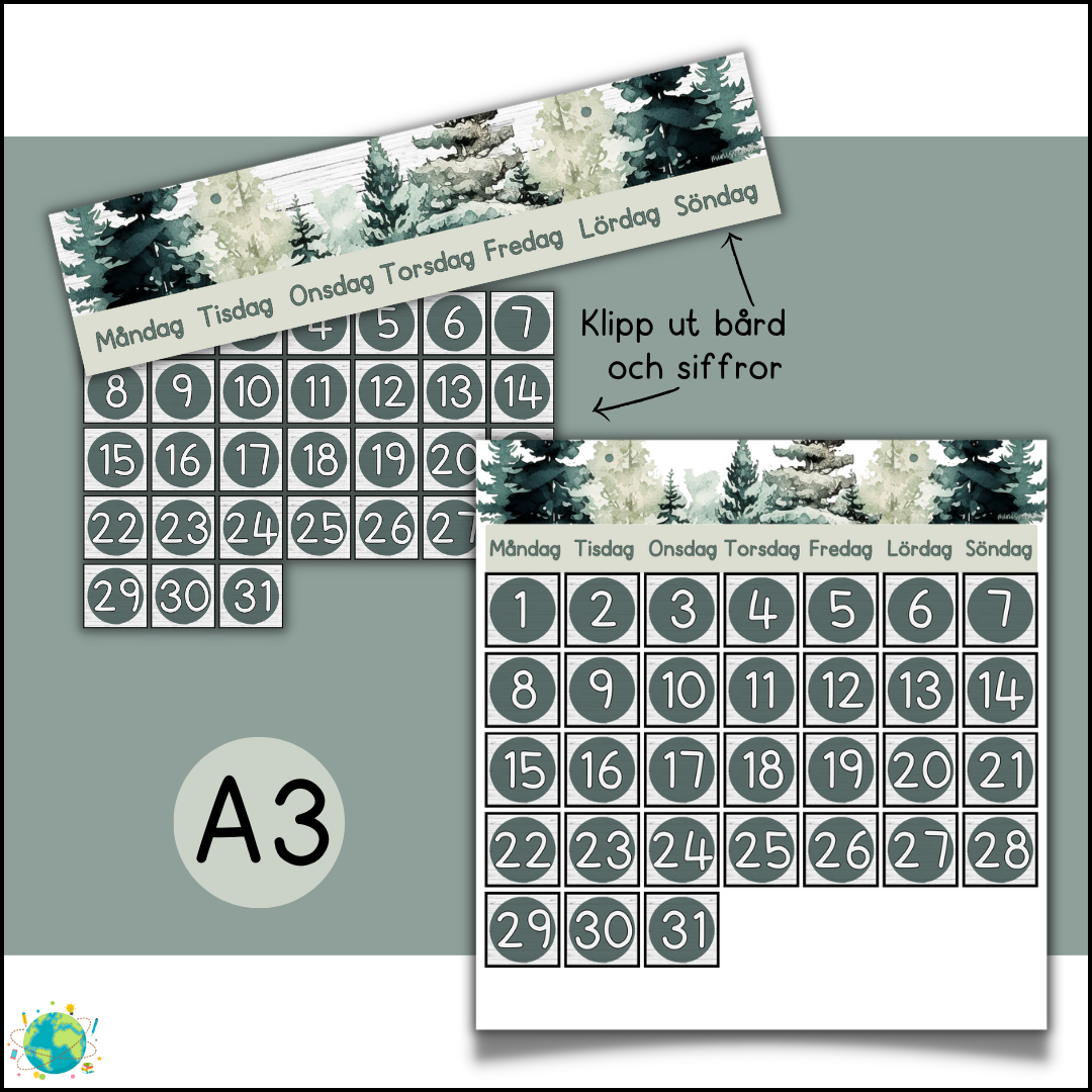 Håll reda på vilket datum det är med denna underbara skogen - kalender. Finns i A3 och A4. A3 har 2 versioner. Laminera för längre hållbarhet. PDF: High quality