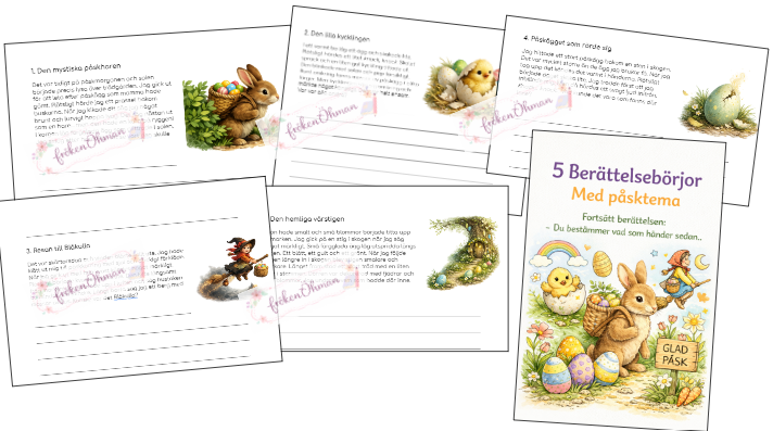 Berättelserna utspelar sig i påskiga miljöer och innehåller början på mysterier, äventyr och oväntade händelser. Perfekt för att träna kreativt skrivande samtidigt som eleverna får arbeta med ett aktuellt tema.