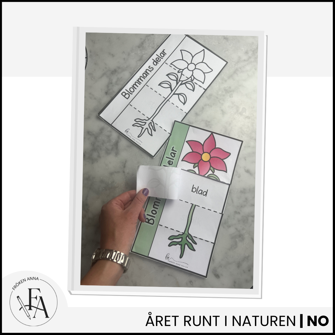 Flikbok som visuellt synliggör blommans delar. Materialet finns i färg och svartvitt samt med och utan begrepp om man vill skriva orden själv.