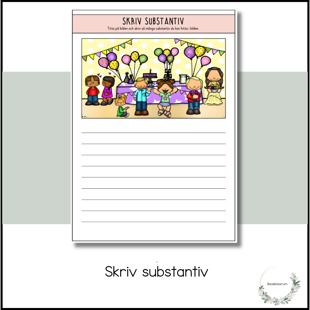 Arbetsblad där eleven ska skriva så många substantiv kan hen kan utifrån en bild.