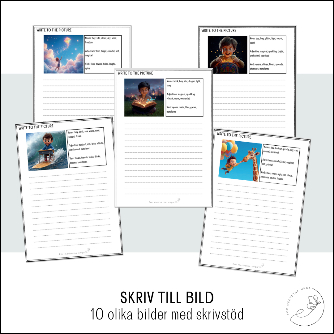 Hej på er 🙂 Här kommer 10 magiska bilder med skrivstöd för att locka eleverna till skrivning. Eleverna ser en  bild + stödord i form av substantiv, adjektiv och verb. Eleven kan skriva en beskrivning eller en berättelse. Finns extra skrivutrymme för de som vill skriva mer. Perfekt för att bli säkrare på ordklasser och locka till skrivning 🙂 Fungerar även bra som startuppgift. Denna är på engelska men jag har även lagt ut en version på svenska.