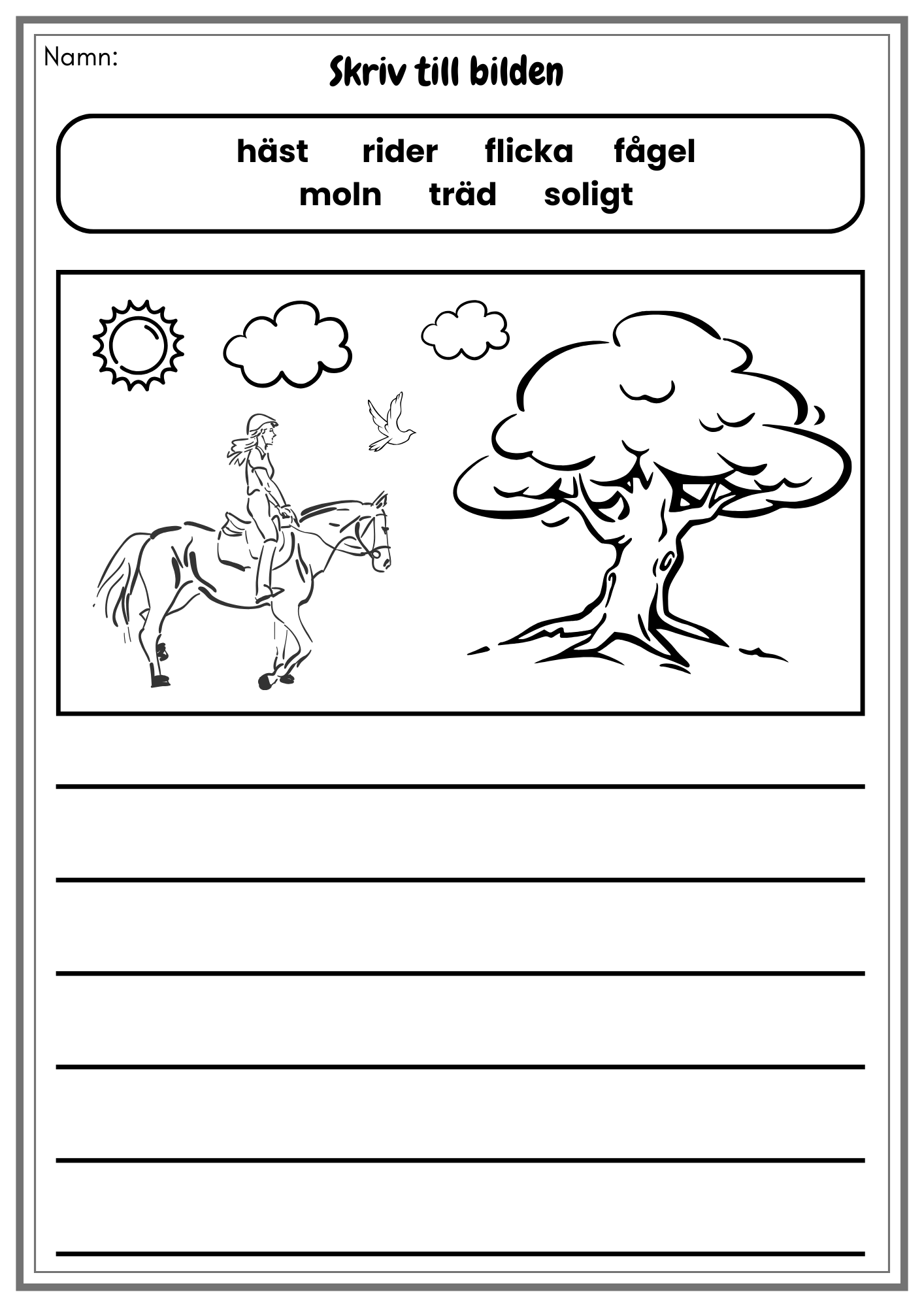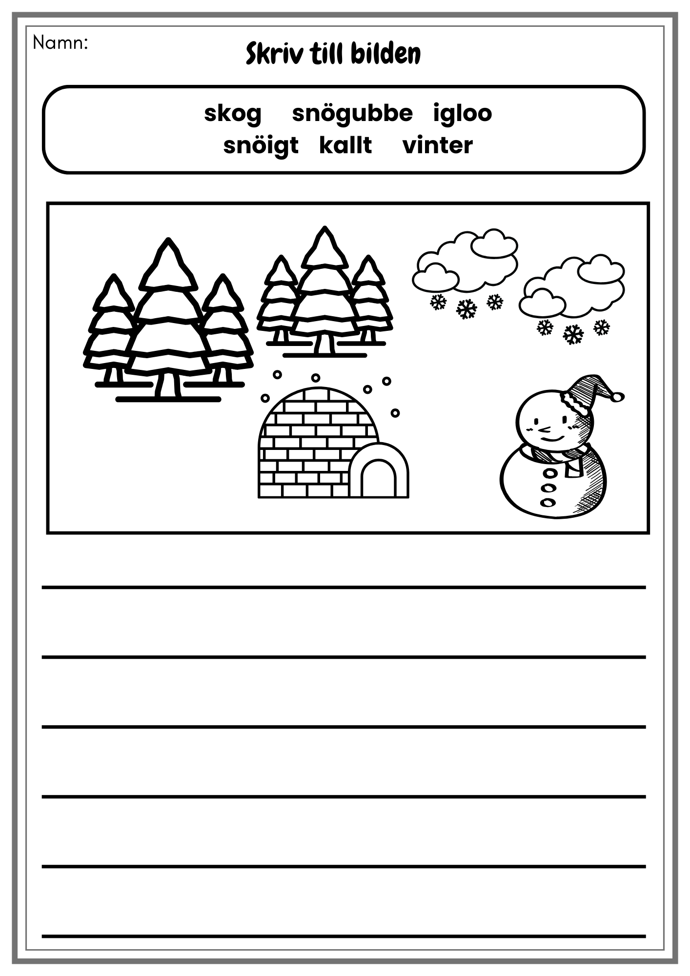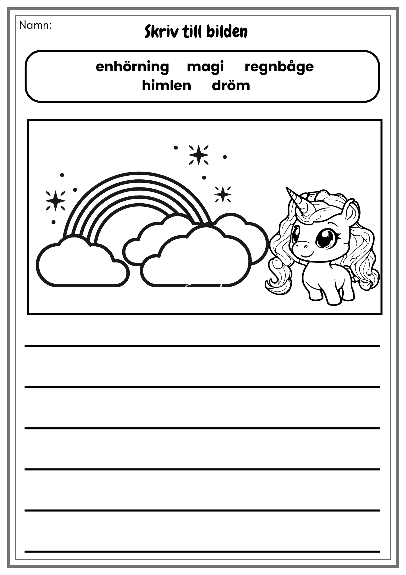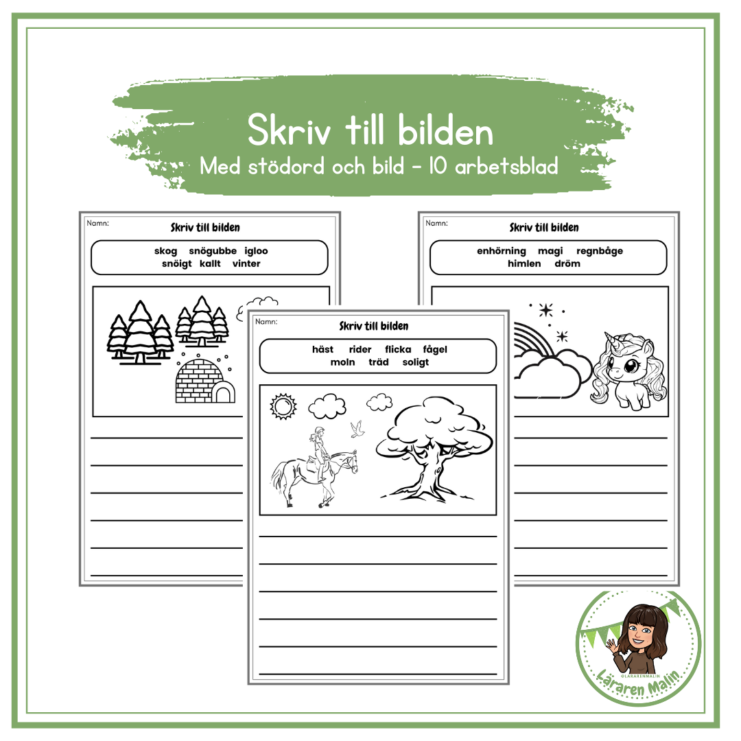 10 arbetsblad där eleverna ska skriva en text till stödord samt en bild.