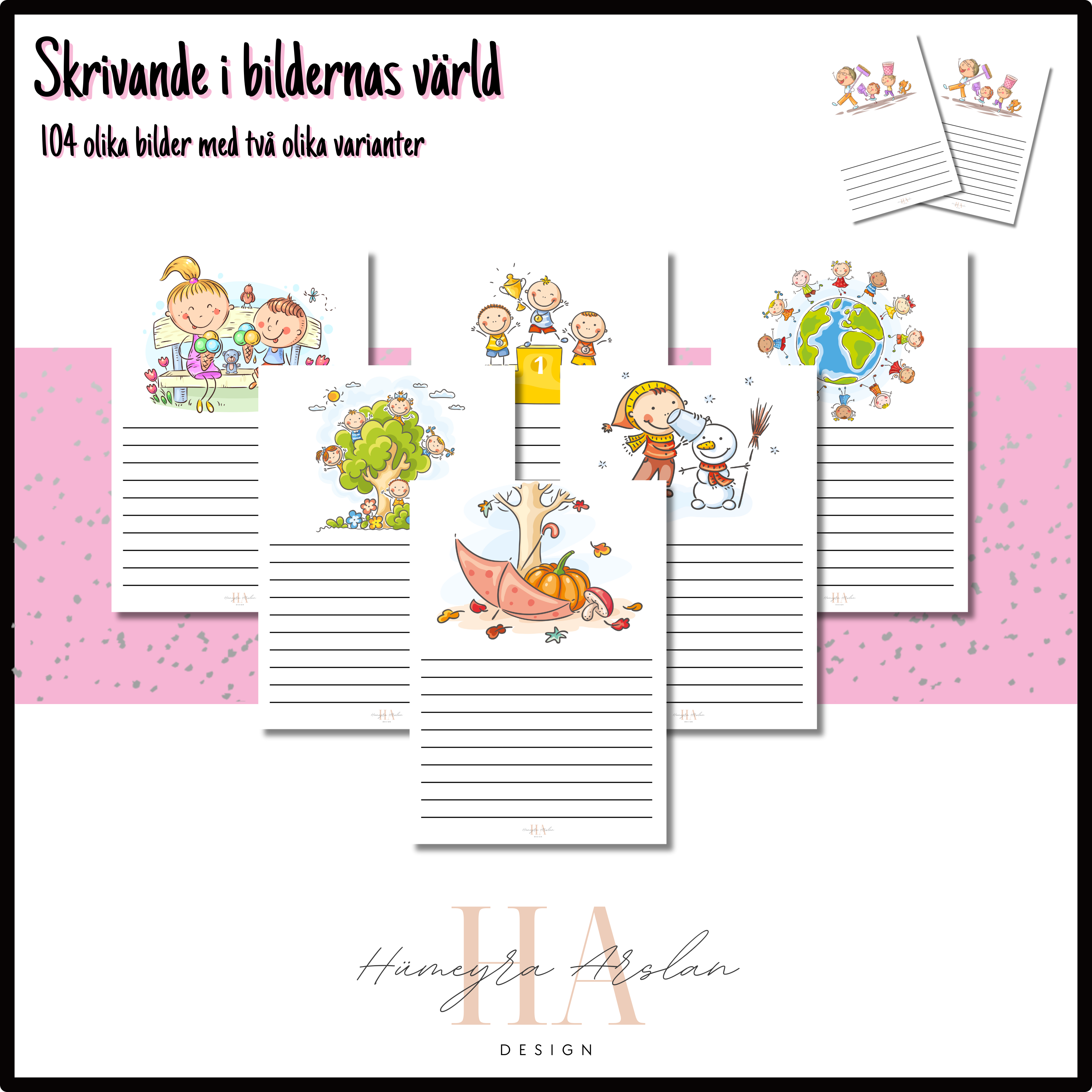 ”Skrivande i bildernas värld” innehåller hela 104 olika bilder, med två olika varianter där det medföljer en med fler rader och en med färre. Temat i materialet är lite blandat och innehåller allt från årstider och högtider till vardagliga bilder. Materialet använder jag själv mycket i mitt klassrum för att uppmuntra elevernas kreativa tankeprocesser men även ge möjlighet till att uttrycka tankar, känslor och idéer i skrift.
