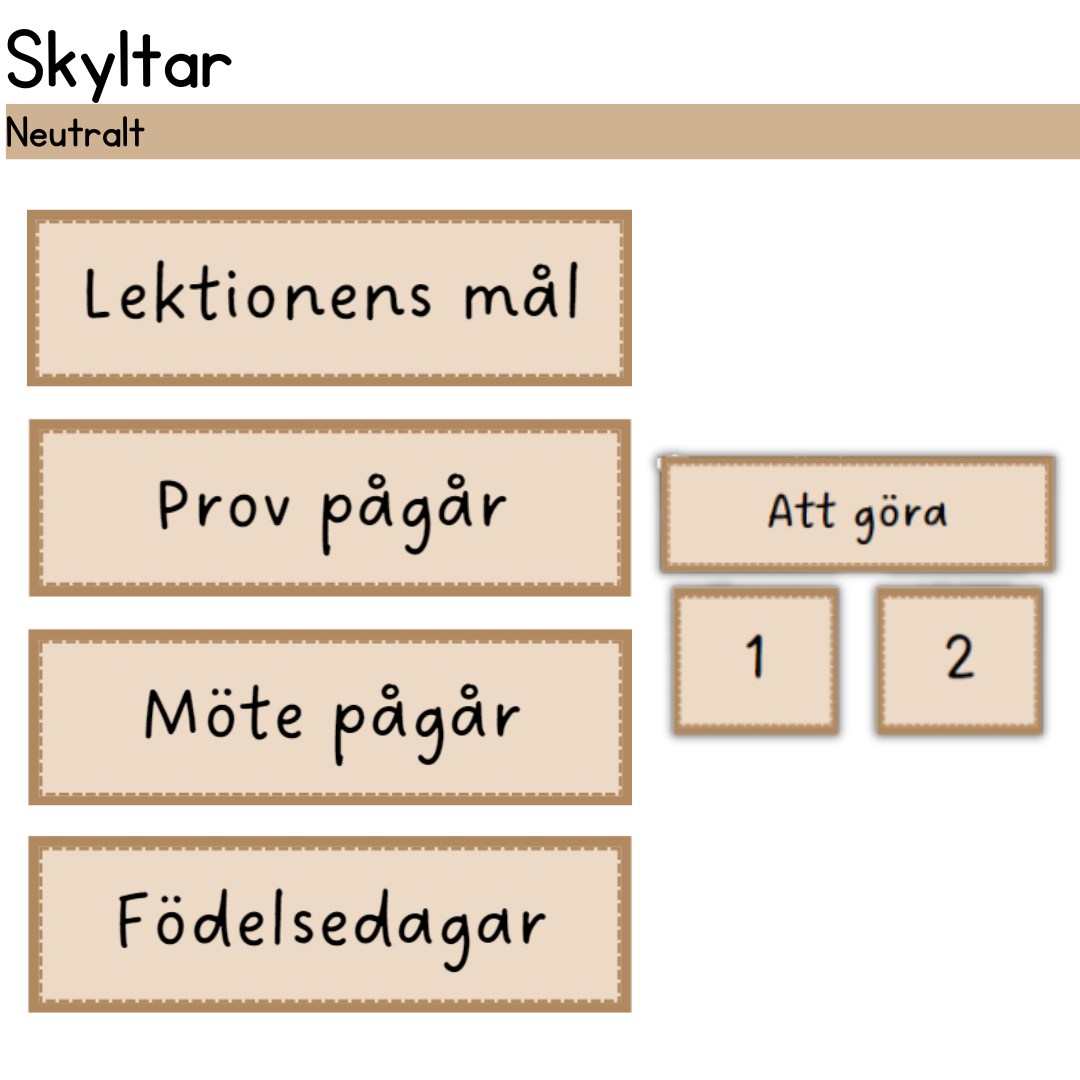 Skyltar som kan sättas upp på dörren eller tavlan i klassrummet. Ingår i mitt neutrala klassrumspaket.