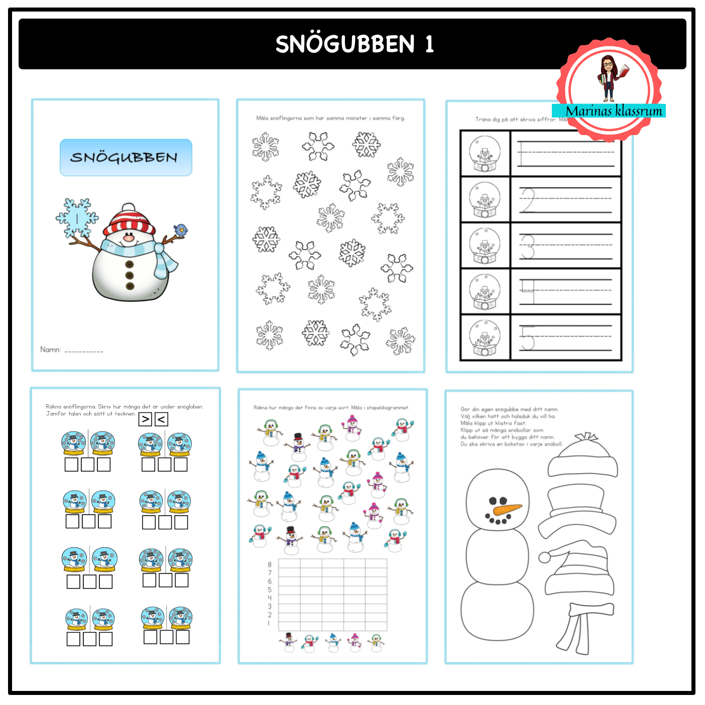 Ett arbetshäfte med vintertema på 12 sidor med olika uppgifter i mattematik och svenska.