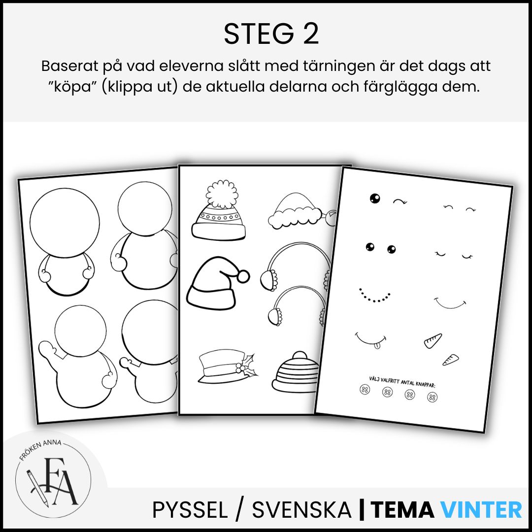 Snögubbsshoppen är ett lekfullt och kreativt material där slumpen styr! Med hjälp av tärningsslag får barnen/eleverna ”handla” olika delar till sin snögubbe och skapa en helt unik figur.