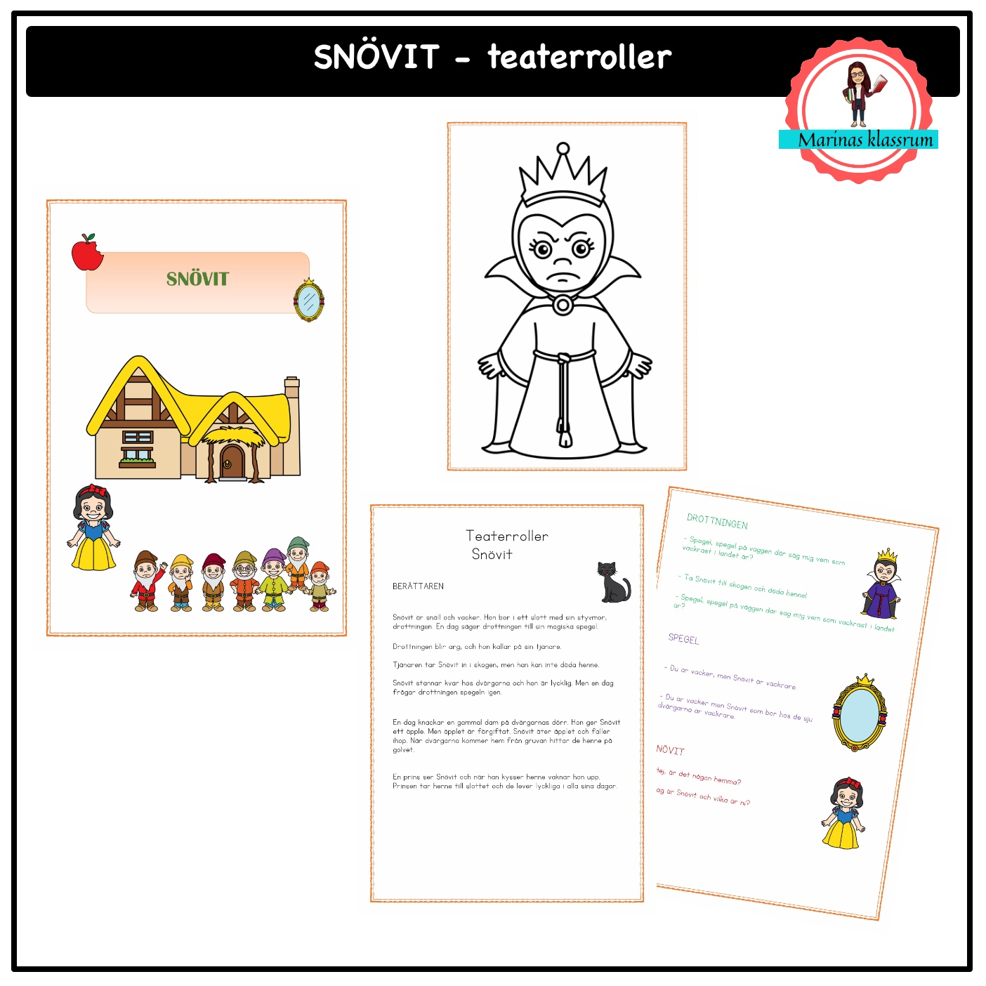 Här är ett material som du kan använda för att dramatisera en känd saga. Hela sagan finns nedskriven i dialogform och sedan finns även varje rolls repliker var för sig samlat på ett annat papper. Rollerna har olika färg i texten så att man ser när det är vem som ska prata. Dessutom ingår även stora svartvita bilder på de olika karaktärerna. Dessa kan eleverna färglägga och klippa ut och sätta på en blompinne så kan man spela en dockteater. Man kan också förstora bilderna och hänga dem i ett snöre runt halsen.
