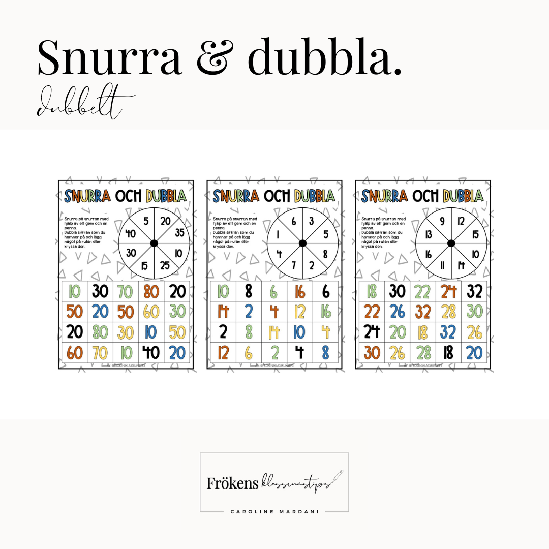3 olika spel av Snurra och dubbla. Dubbla talen: - 1-8. -9-16 -5, 10, 15, 20, 25, 30, 35, 40. Kan användas som en extra uppgift i undervisningen.