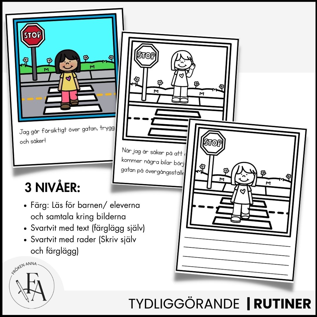 Visualisera det abstrakta när ni går igenom den viktiga informationen över varför det är så viktigt att titta åt båda håll när man går över gatan.  I paketet ingår en minibok i färg att läsa tillsammans med barnen, innan de själva får färglägga bilderna till sin egen bok och träna på att berätta texten / informationen till bilderna. Det ingår även en mall med tomma rader om barnen / eleverna kan skriva själva.
