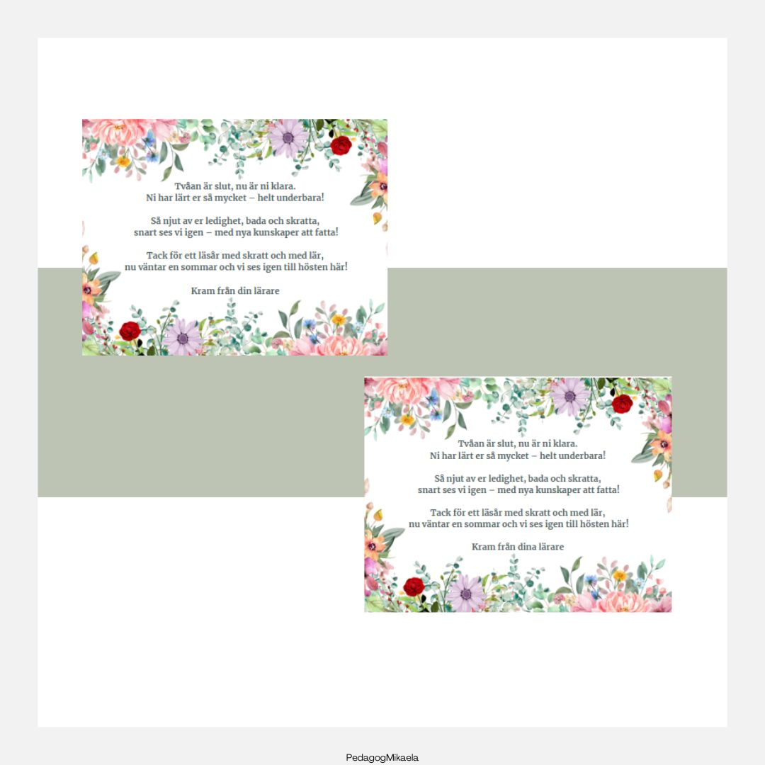 Sommarkort att ge till dina elever, kommer i två olika avslut för årskurs F-5. Du kan välja mellan "Kram från din lärare" eller "Kram från dina lärare".