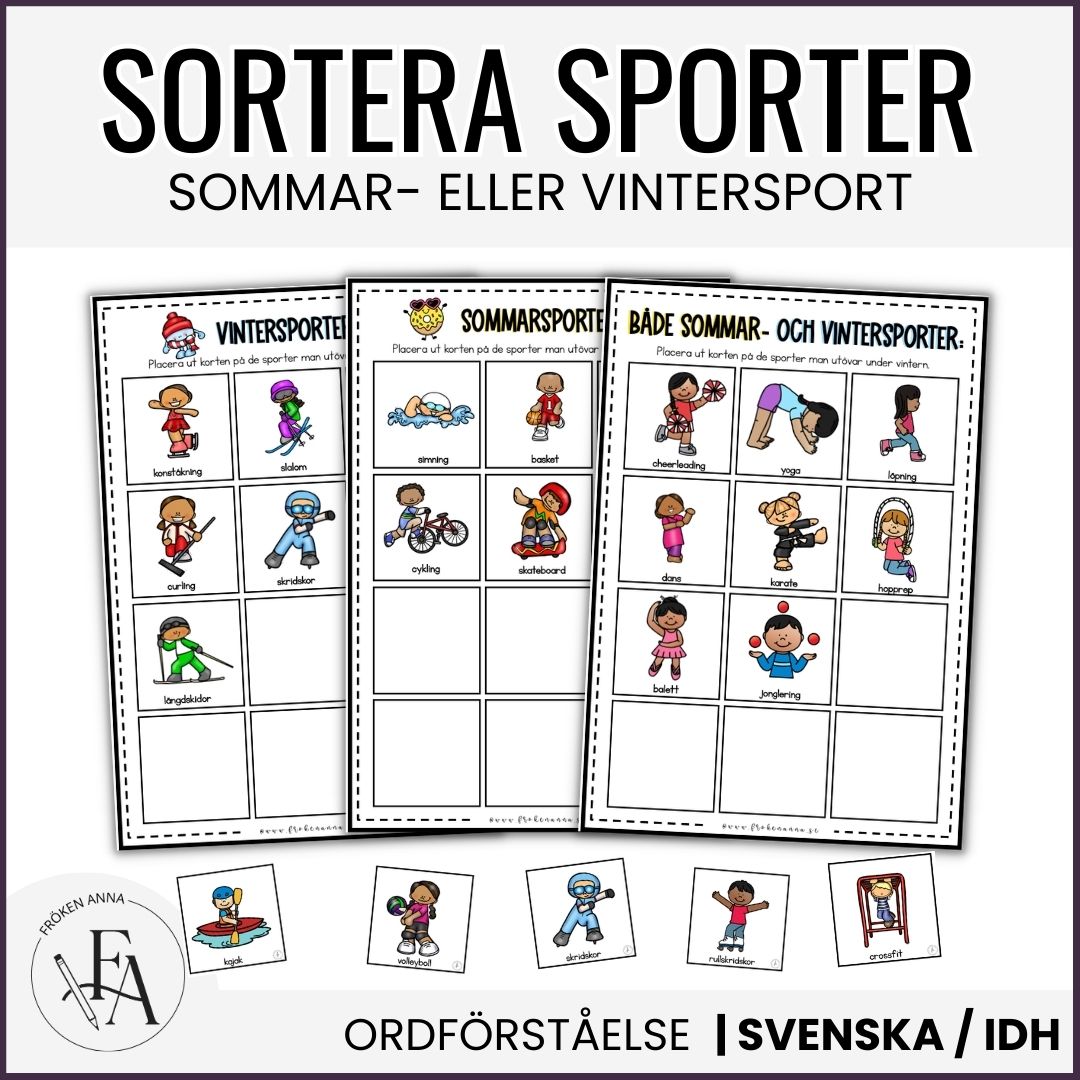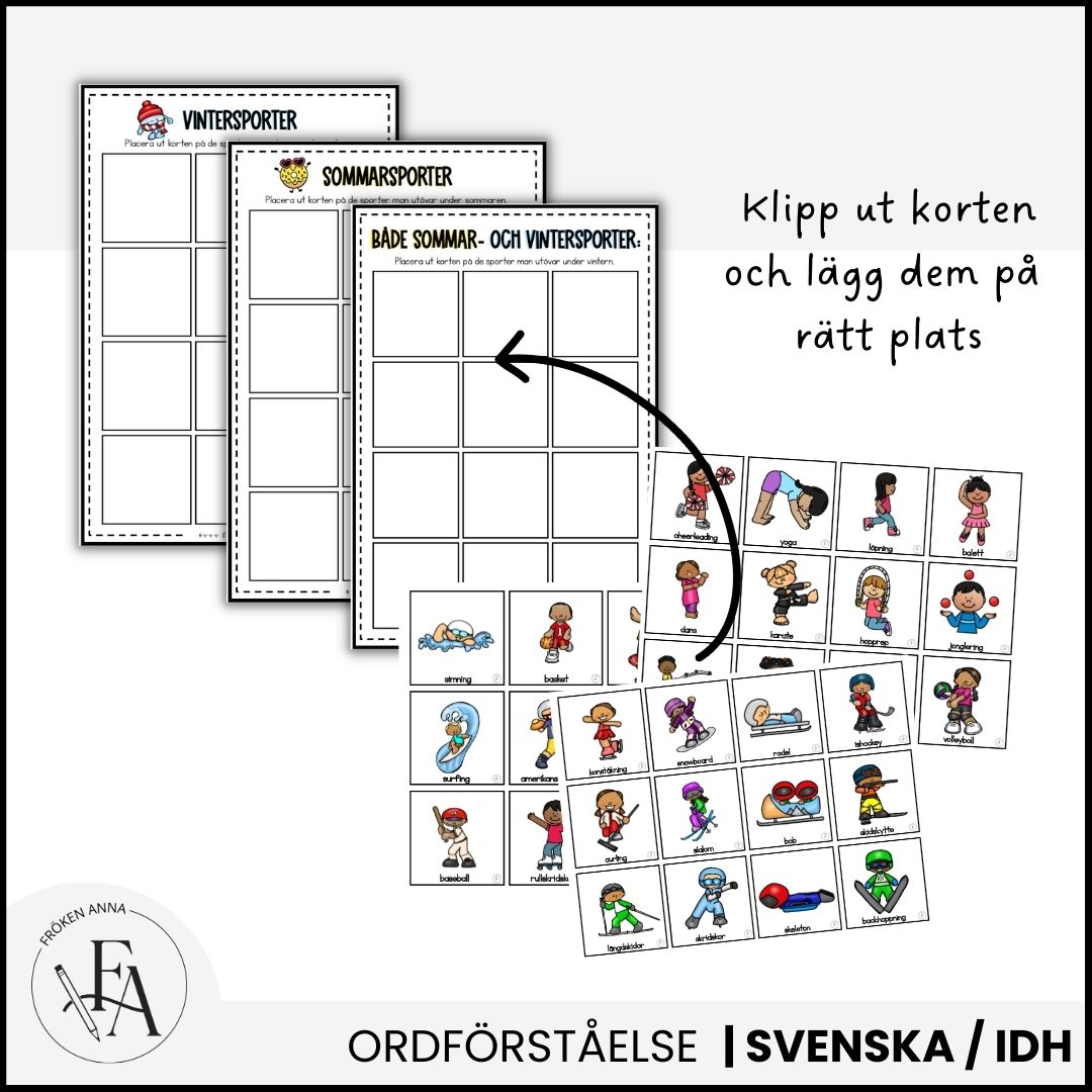 Utövas sporten på sommaren eller vintern? Eller både och? I det här materialet får barnen/eleverna utöka sitt ordförråd av olika sporters namn genom att sortera ordkort till rätt bricka. Bilderna kan även skrivas ut som dubletter och användas som memory.