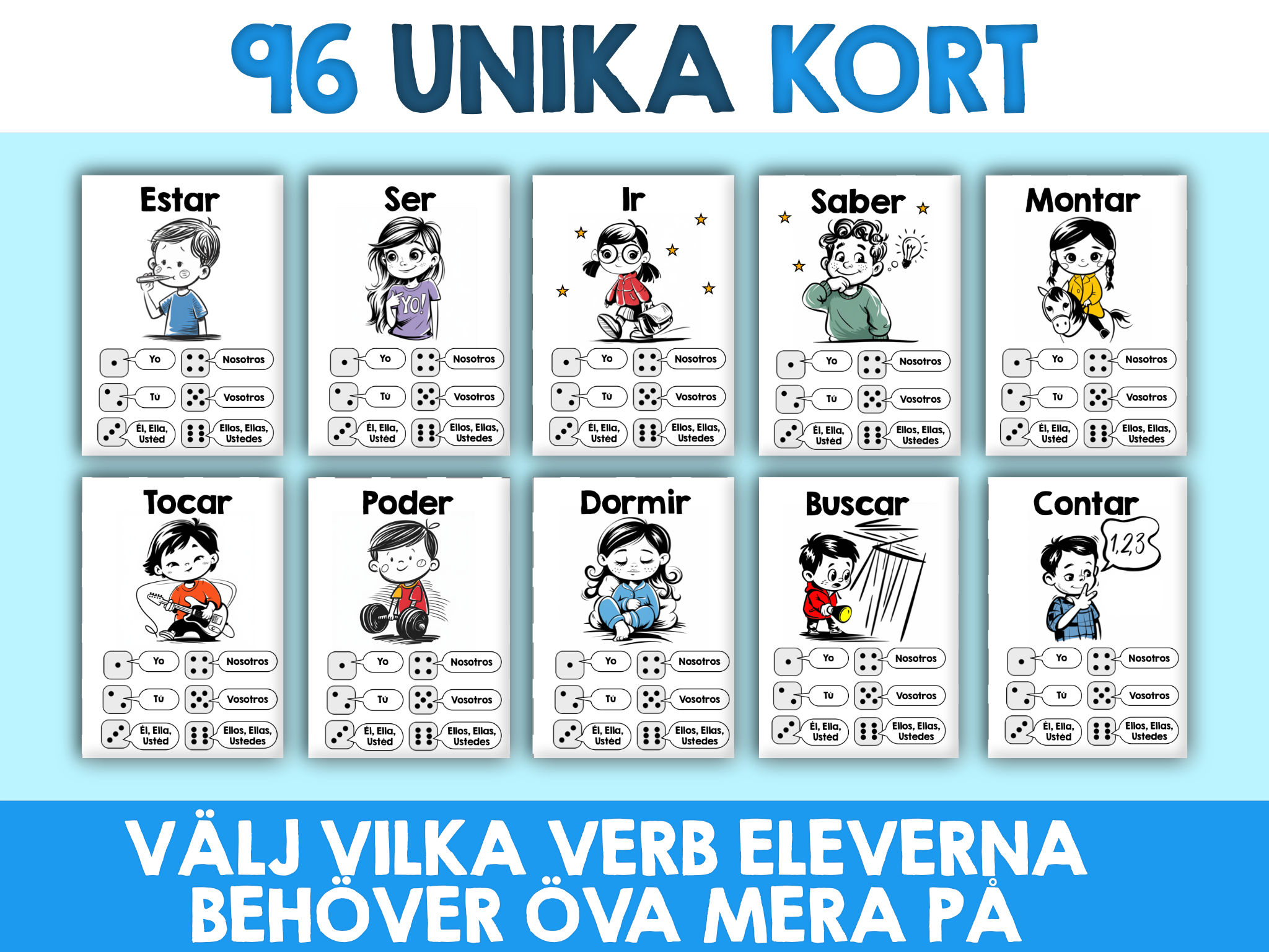 • 96 verbkort med vanliga spanska verb, varje kort med en unik illustration för att stödja ordförrådsinlärning.