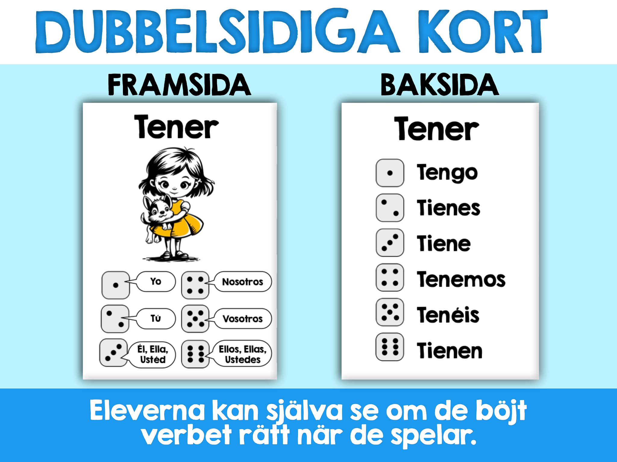 Spelarna turas om att dra verbkort, kasta tärningen och böja verbet i rätt form baserat på vad tärningen visar. Böjningsformerna finns på baksidan av varje kort, så eleverna kan kontrollera sina svar medan de spelar, vilket uppmuntrar till självständigt lärande. De valbara Power-Up-korten låter spelarna tjäna extra poäng, utmana andra eller lägga till en strategisk twist. Spelet kan spelas tills en viss poäng uppnås eller tills alla kort är slut.