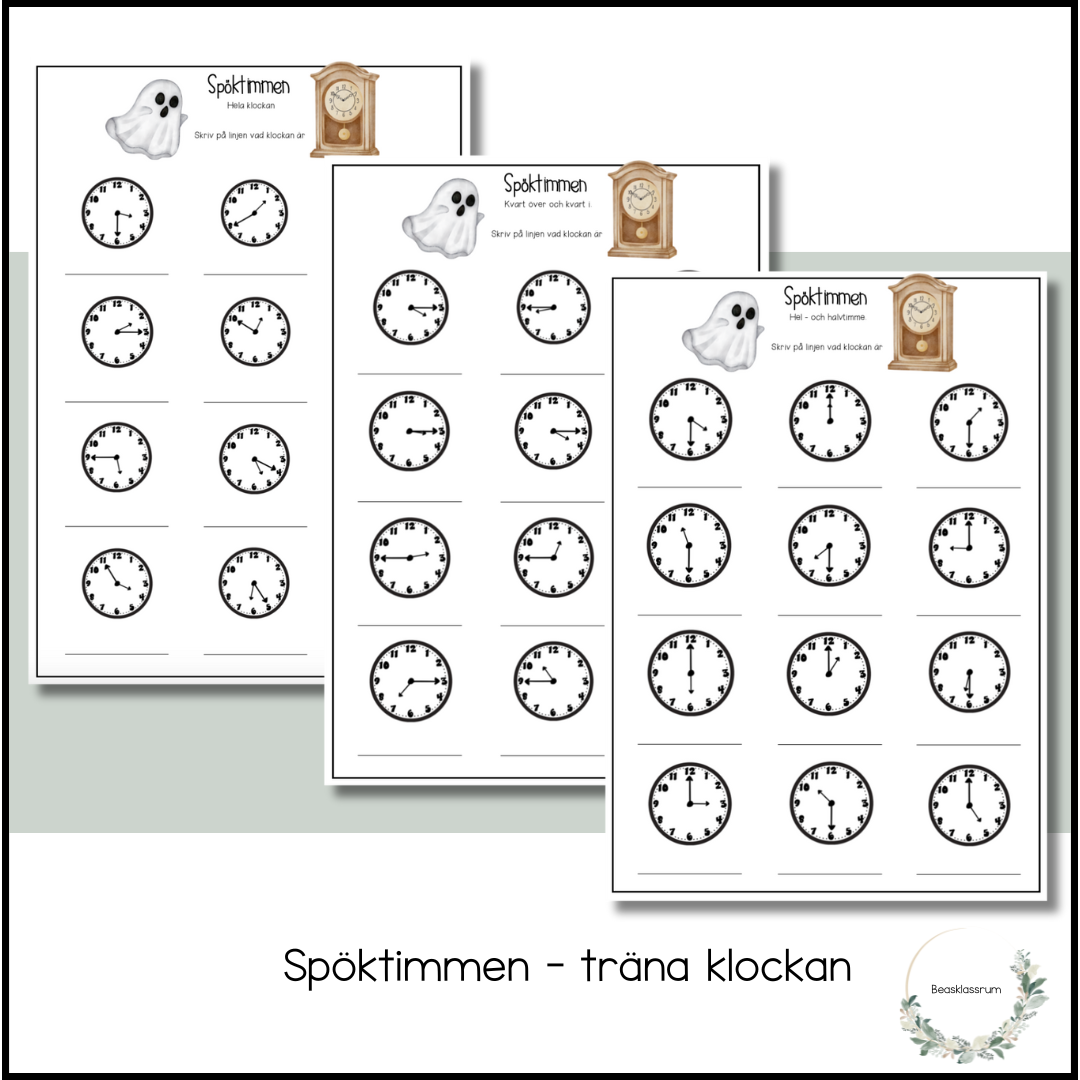 Spöktimmen - träna klockan 3 arbetsblad där eleverna får träna * hel -och halvtimme *kvart i och kvart över *hela klockan