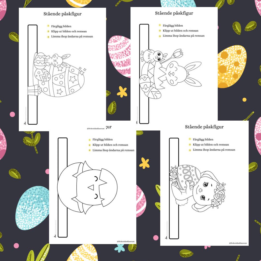 4 stående påskfigurer med olika motiv att måla, klippa och limma ihop.
