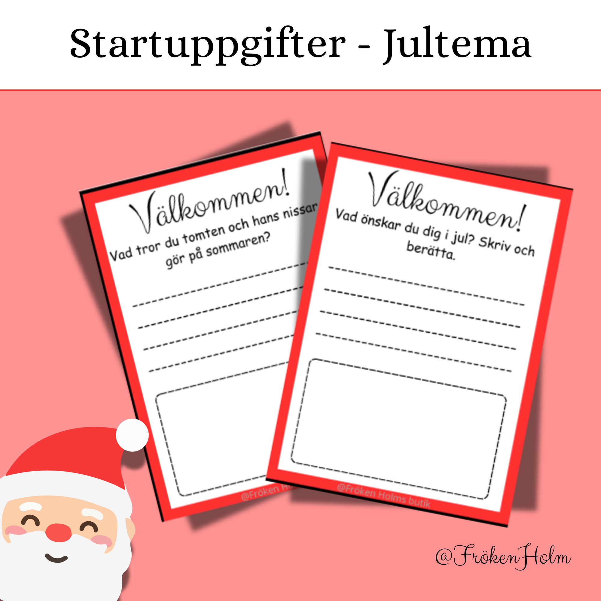 20 olika startuppgifter med jultema. Eleverna kommer in i klassrummet och får exempelvis göra en startuppgift per dag. Materialet passar alla elever i åk 1-6 och eleverna övar att skriva. Startuppgifterna kan vara att eleverna ska beskriva det godaste julgodiset eller vad de tror tomten gör på sommaren. Du kan antingen låta eleverna göra samma startuppgift eller att de får olika varje dag.