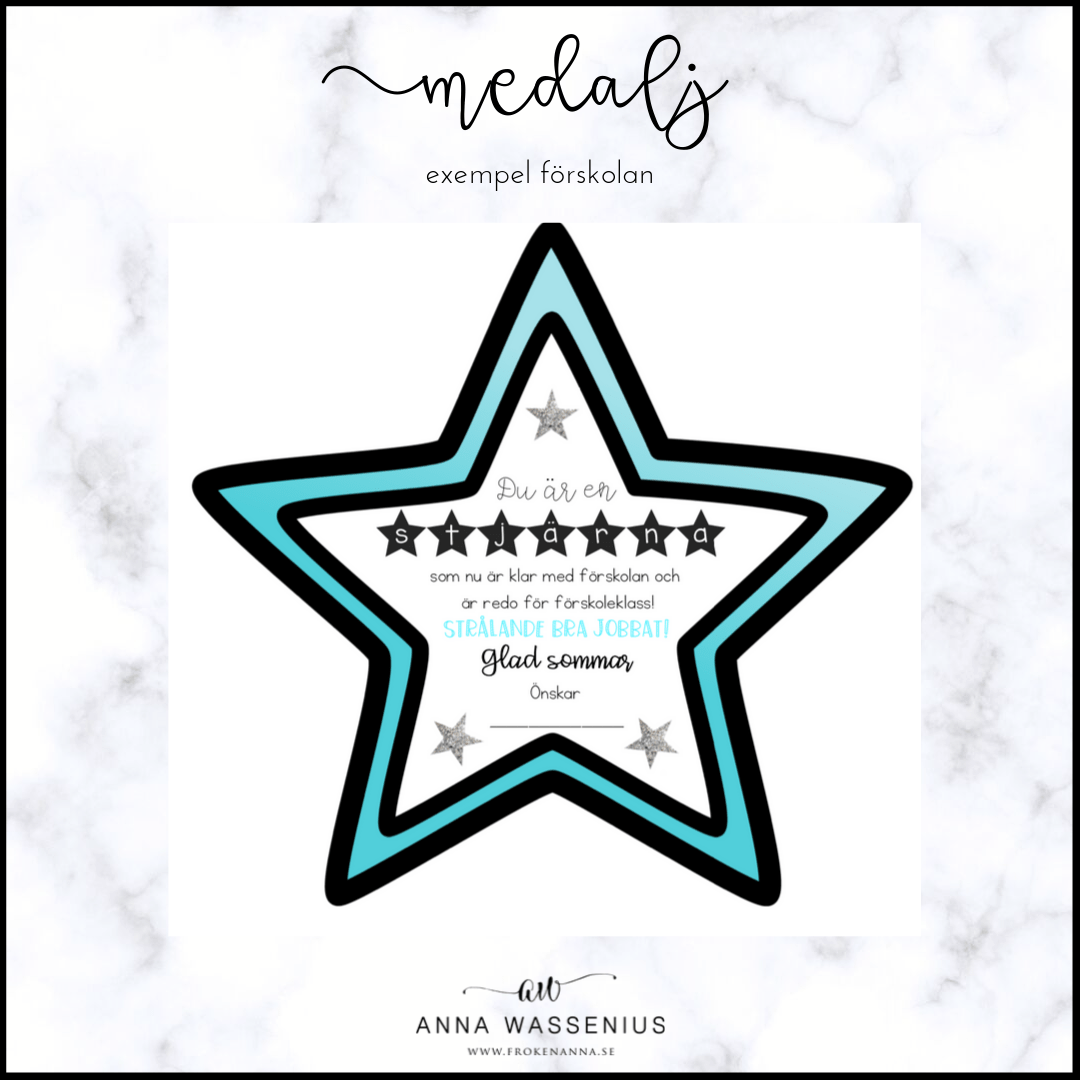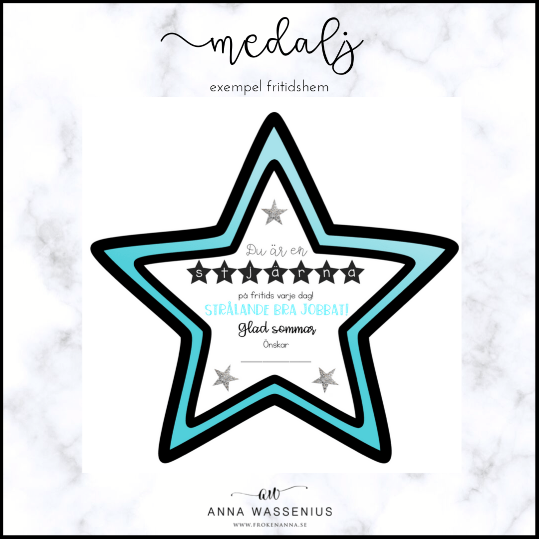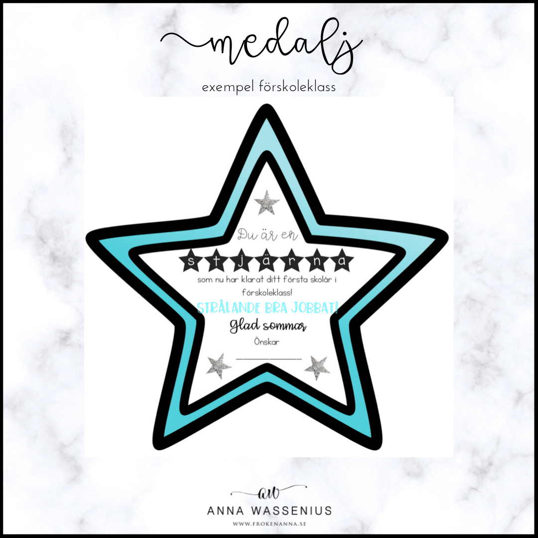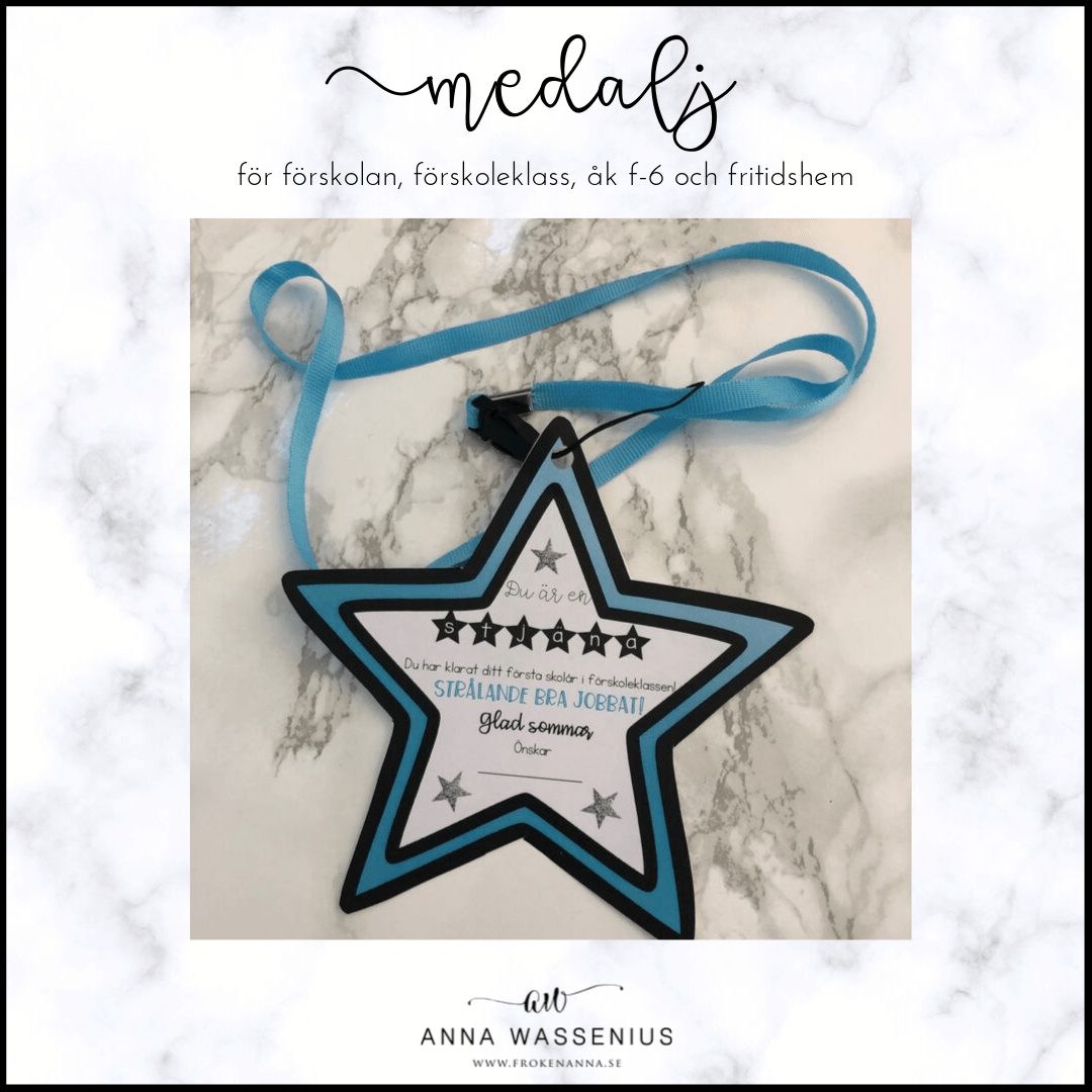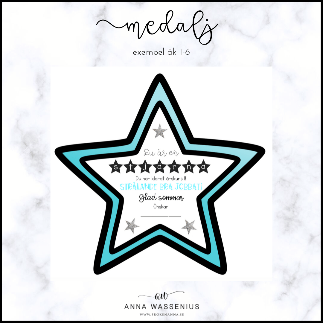 Stjärnmedalj att ge till eleverna på skolavslutningen. Materialet är anpassat för förskolan, förskoleklass och åk 1-6 samt fritidshem. Skriv ut, laminera och häng på ett presentsnöre eller band.