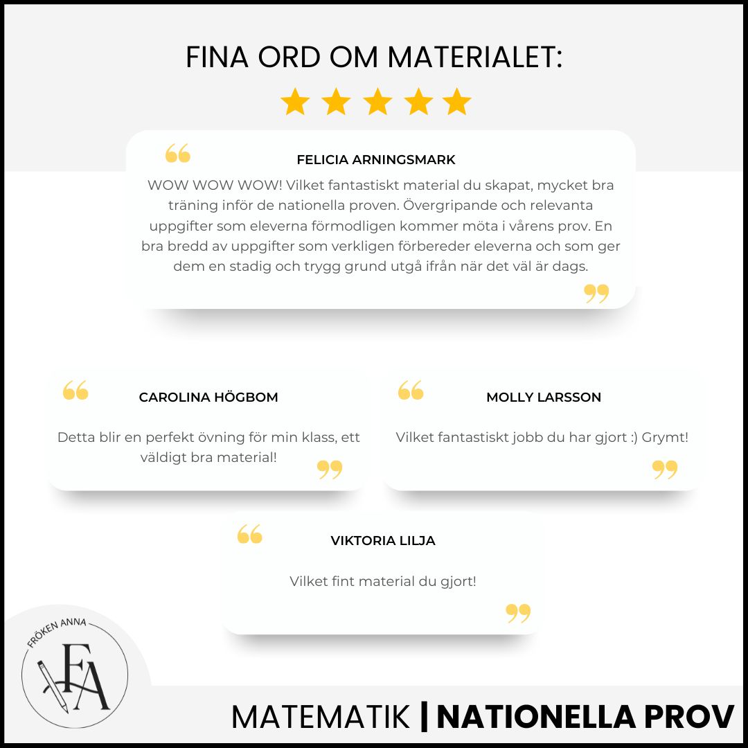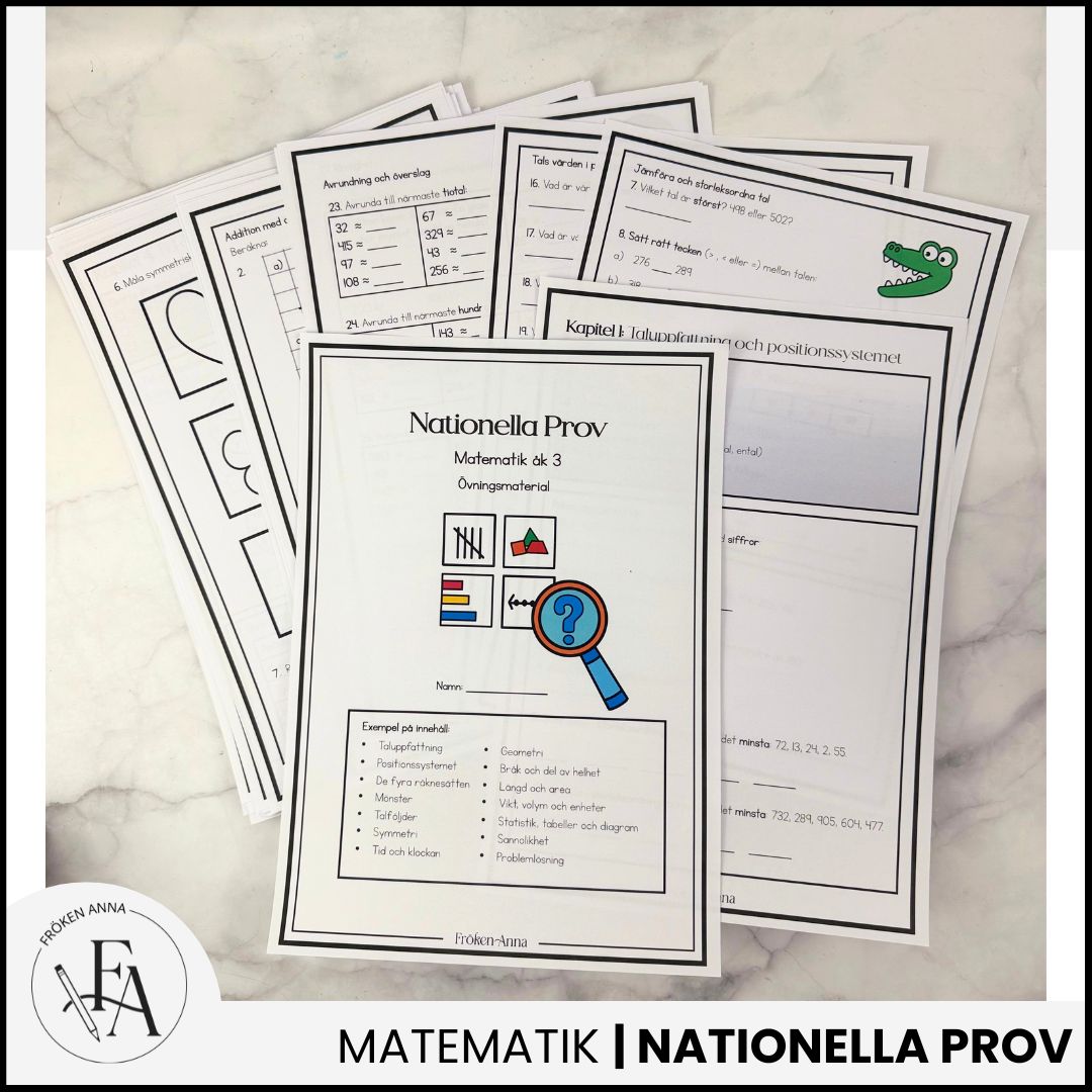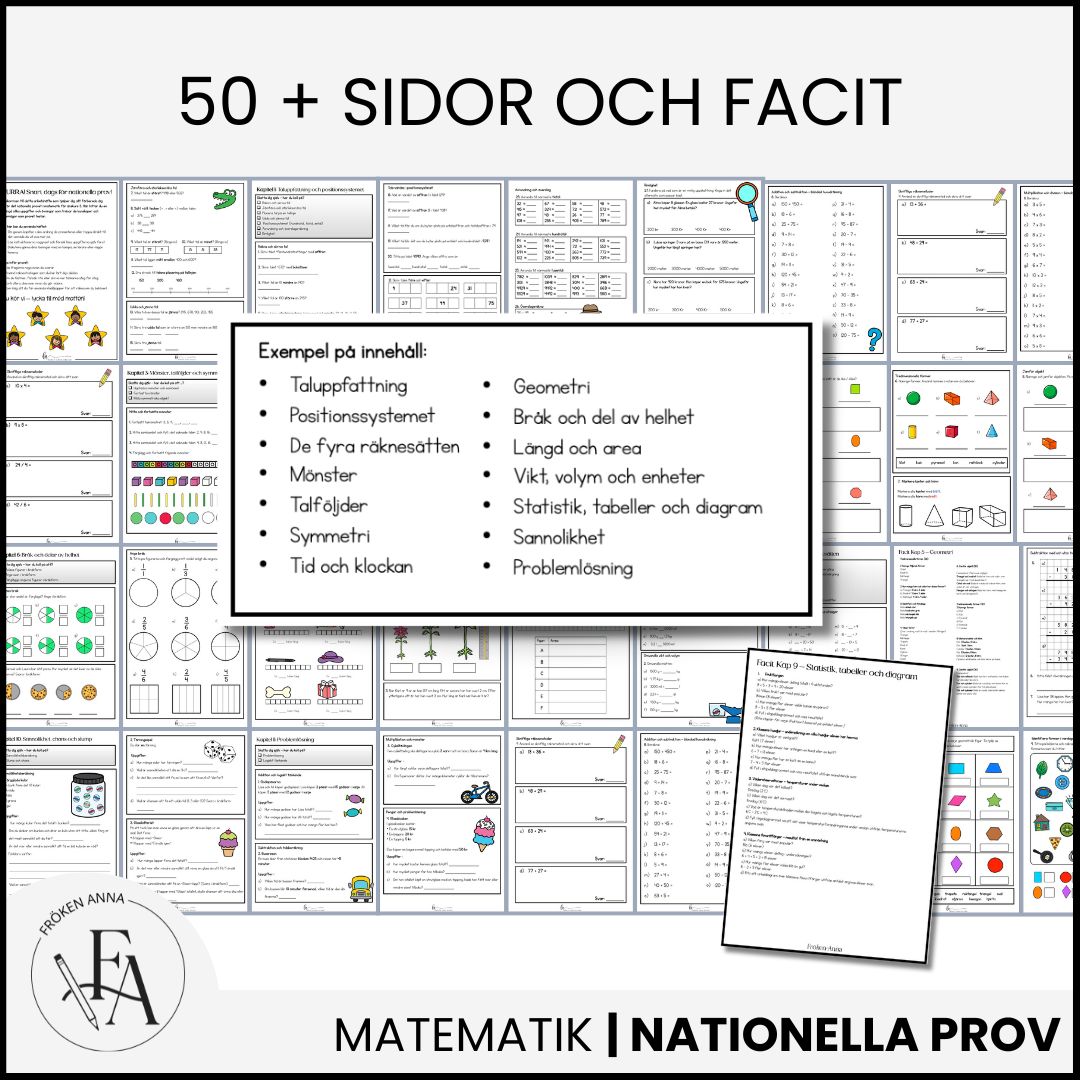 ✅ Förbered dina elever på bästa sätt inför nationella provet i matematik! Detta omfattande material hjälper elever i årskurs 3 att träna på de matematiska moment som brukar testas under de nationella proven. Genom tydliga och struktureradde övningar och varierade uppgifter får eleverna en trygg och grundlig repetition. 📖 Exempel på Innehåll:✔ Taluppfattning och positionssystemet✔ De fyra räknesätten: addition, subtraktion, multiplikation och division✔ Mönster och talföljder✔ Symmetri och geometriska former✔ Tid och klockan✔ Bråk och delar av helhet✔ Längd, area, vikt och volym✔ Statistik, tabeller och diagram✔ Sannolikhet och chans✔ Problemlösning och logiskt tänkande 📌 Vad får du? Över 100 uppgifter för självständig träning Facit ingår för enkel rättning Perfekt för klassrumsarbete, hemarbete eller repetition inför provet 📥 Ladda ner, skriv ut och börja öva direkt!